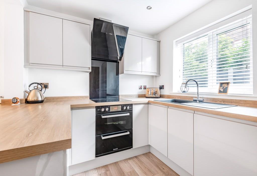 Fitted with white wall and base units and butcher block style worktops incorporating integrated appliances comprising of a fridge-freezer, dishwasher, oven, extractor hood whilst providing breakfast bar seating and space for dining furniture.