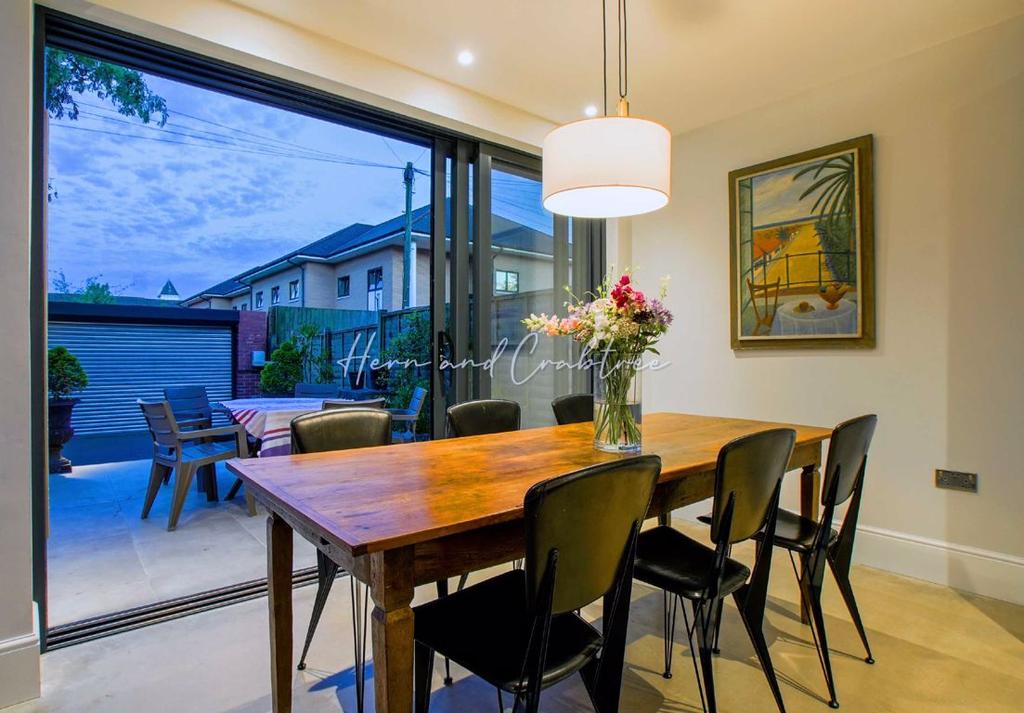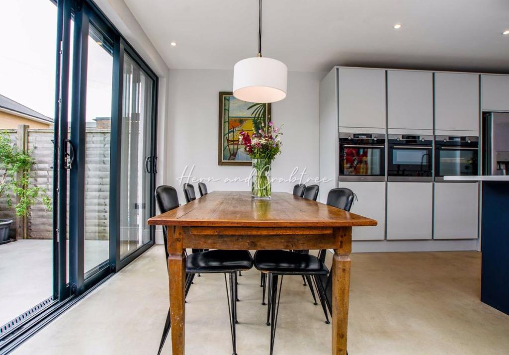 Ample space for living and dining furniture, TV aerial connection point, bespoke aluminium door and sliding doors opening to the rear garden.