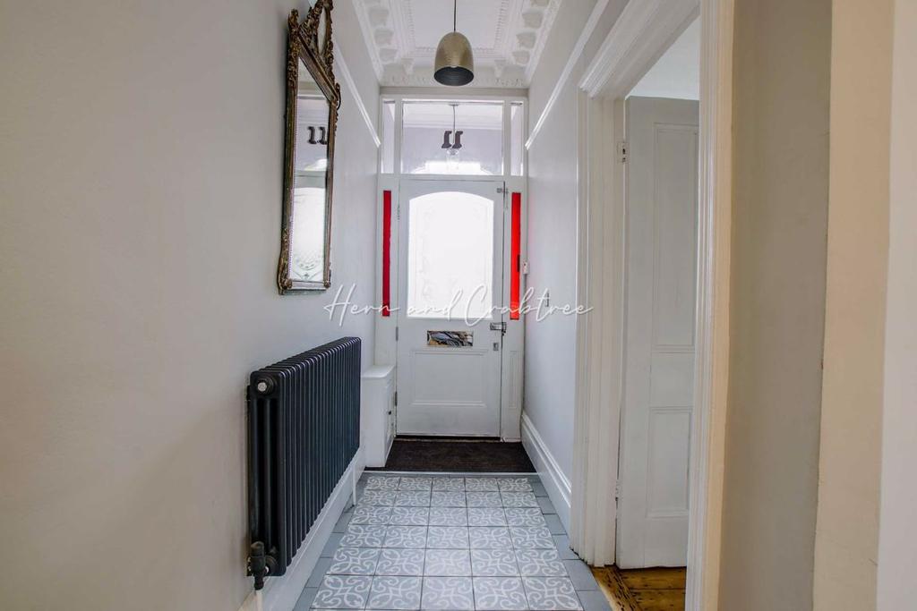 Entrance Hall - Accessed via front door with obscured glazed panel, opening to hall. Original cornicing, picture rail, fitted door-matt, radiator and geometric tiled floor. Door to living room and open to family room, inner lobby and cloakroom. Stairs rising to first floor landing with under-stairs door to coal-chute cellar.