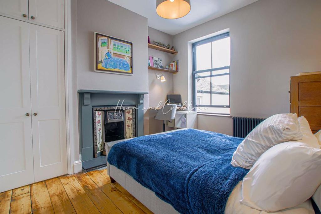 Bedroom Two - 12'2 x 11'1 (3.71m x 3.38m) - Double glazed sash window to rear, fitted wardrobe, sunken ceiling spotlights, radiator, power points, exposed wood floorboards and fireplace with tiled surround, mantle and hearth.
