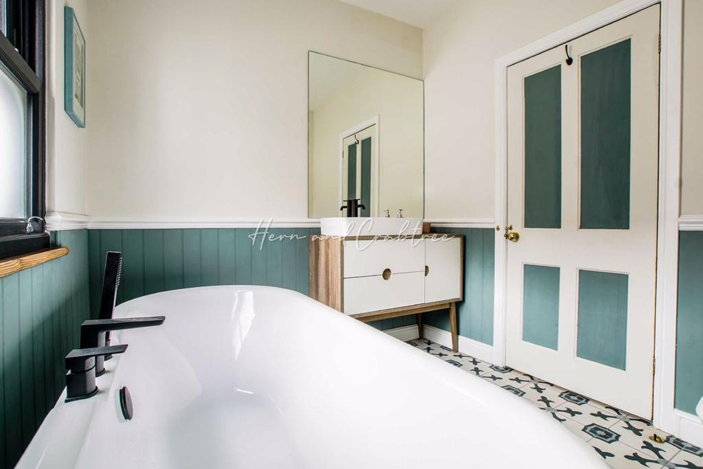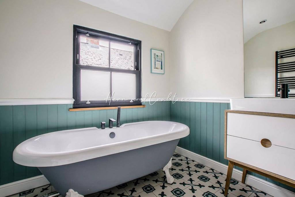Bathroom - 8'3 x 7'6 (2.51m x 2.29m) - Comprising a low level W.C, vanity unit wash hand basin with mixer tap and free-standing roll-top bathtub with central taps and extendable shower fitting. Obscured double glazed sash window to side, wood panelled walls to half height, sunken ceiling spotlights and geometric tiled floor.