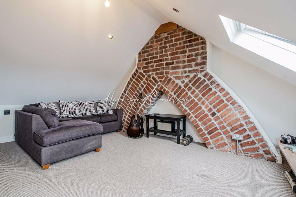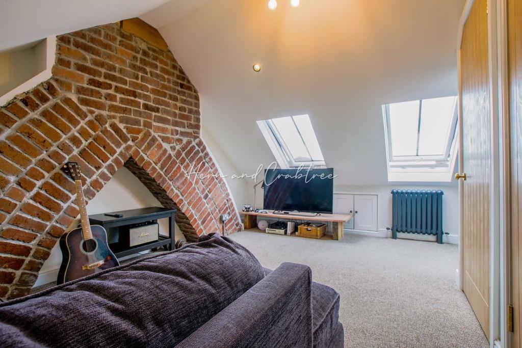 The second floor is arranged with one bedroom with feature exposed brick chimney breast, plenty of eaves storage and contemporary style en-suite shower room.