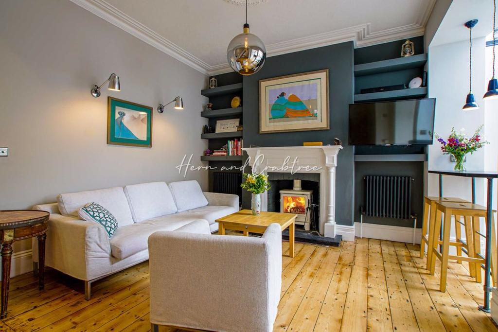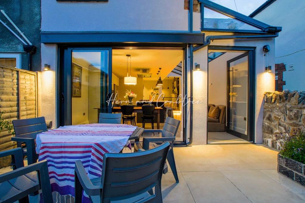 Entry is through a front garden with original quarry-tiled path. An entrance hall leads on from the sheltered porch, with the bay-fronted lounge immediately to the left and open to the colourful family room, with wood-burner stove, on-trend decor, eclectic range of wall and pendant lights and a sweeping view through the kitchen out to the garden. To the right is the inner-lobby with access to cloakroom and coal-chute cellar.