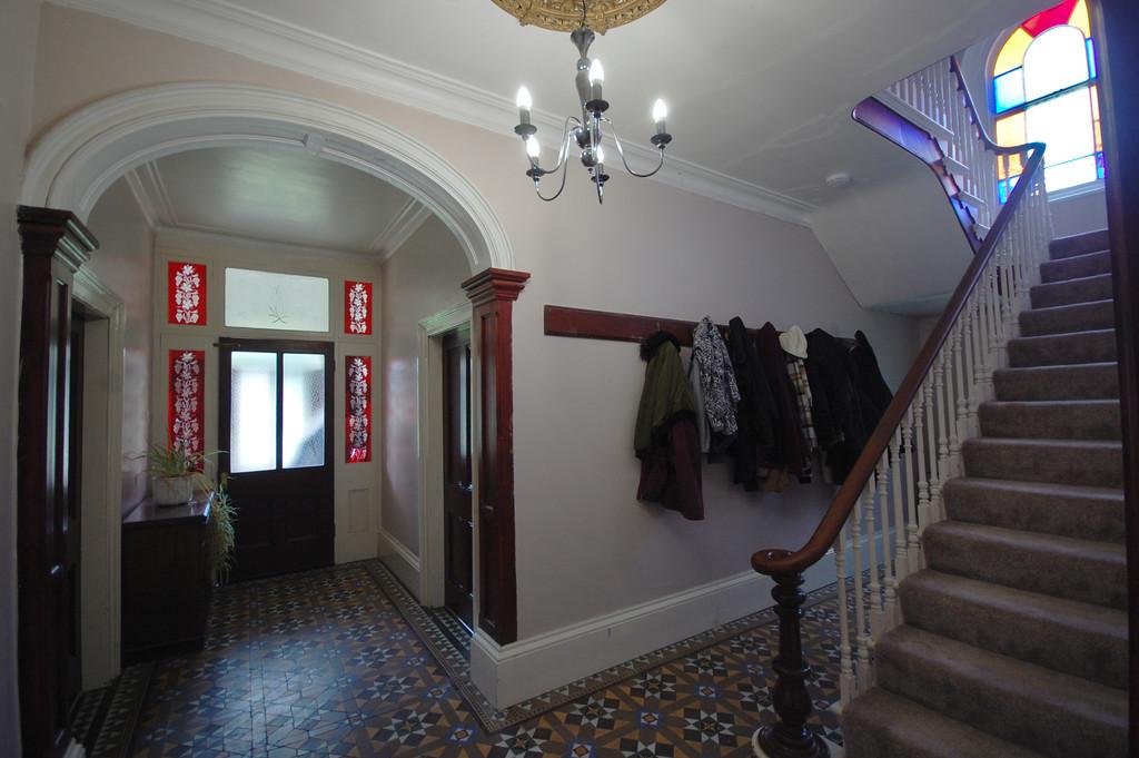 Further part-glazed door (double-glazed) with decorative glazing on the side elevation leading to outside. High coved ceiling, ornate decorative rose with ceiling light point and coat hooks to long wall plaque. Radiator and door chimes.