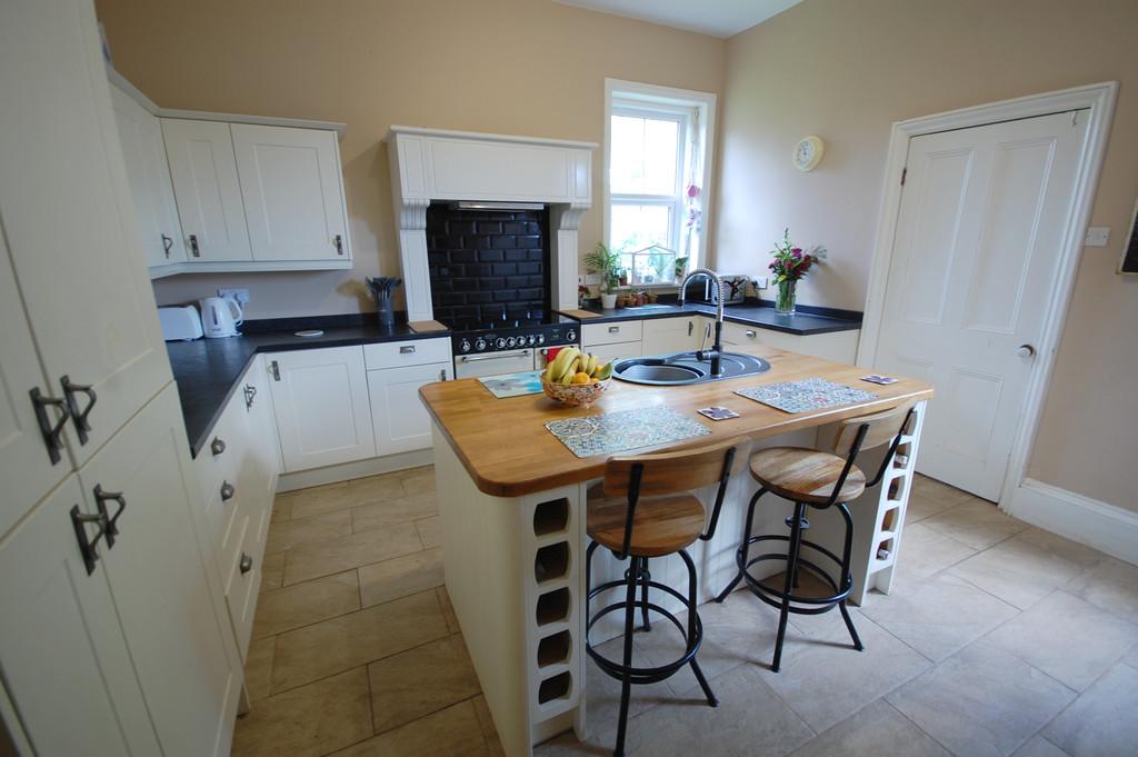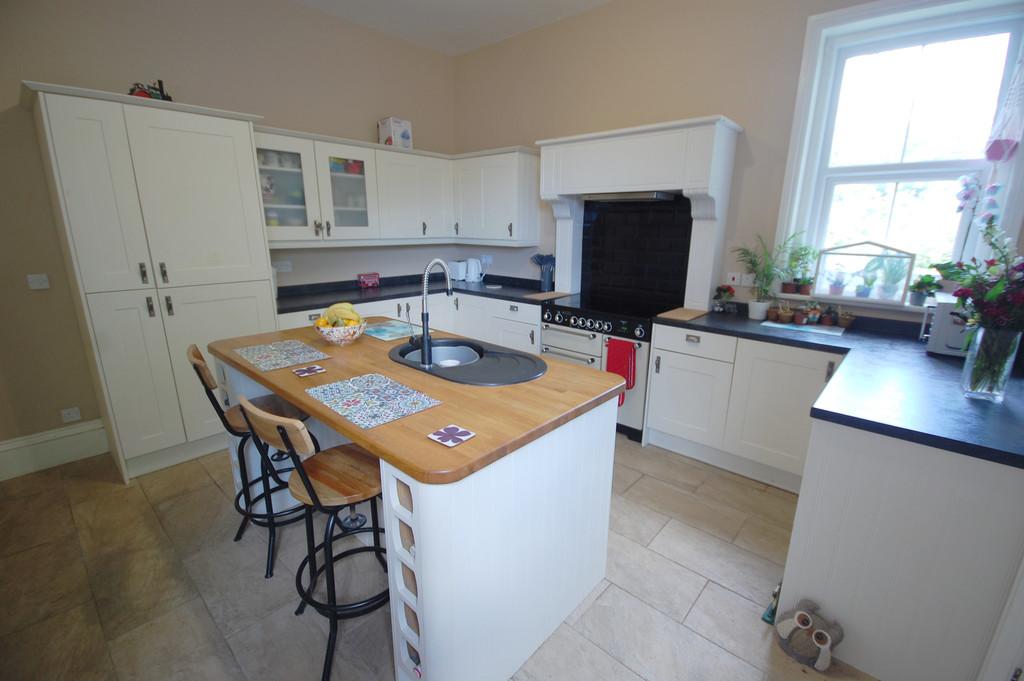 Breakfast Kitchen With a modern range of units finished in ivory colour with ornamental handles and comprising base cupboards and drawers, roll-edged work surfaces and upstands, integrated fridge/freezer, matching range of wall cupboards with two glazed cabinets and an inset Rangemaster Kitchener 90 electric range cooker with two ovens, grill and ceramic hob, together with an Electrolux cooker hood fitted inside a pillared surround. Island unit with hardwood block work and dining surface further double base cupboard under, integrated dishwasher, acrylic oval-shaped single drainer sink unit with flexible hose mixer tap and breakfast bar with wine stores beneath. Ceramic tiled floor, window to the side and rear elevations, four spotlights to ceiling fitting and radiator. Door to a good size recessed cupboard with shelving.