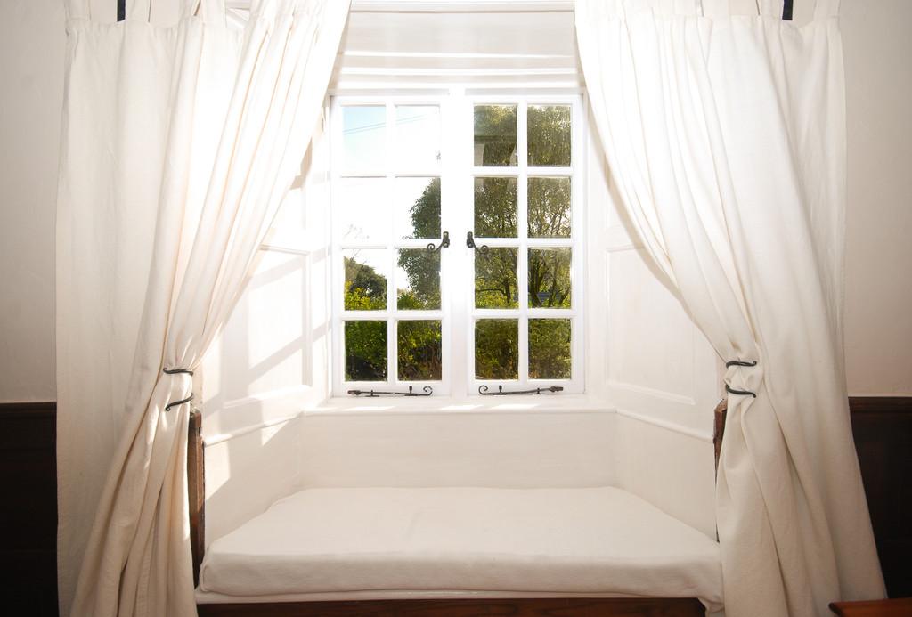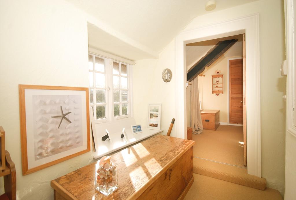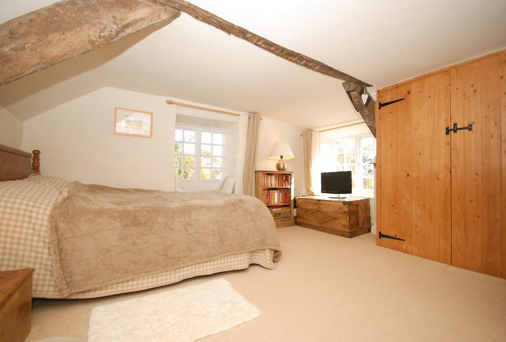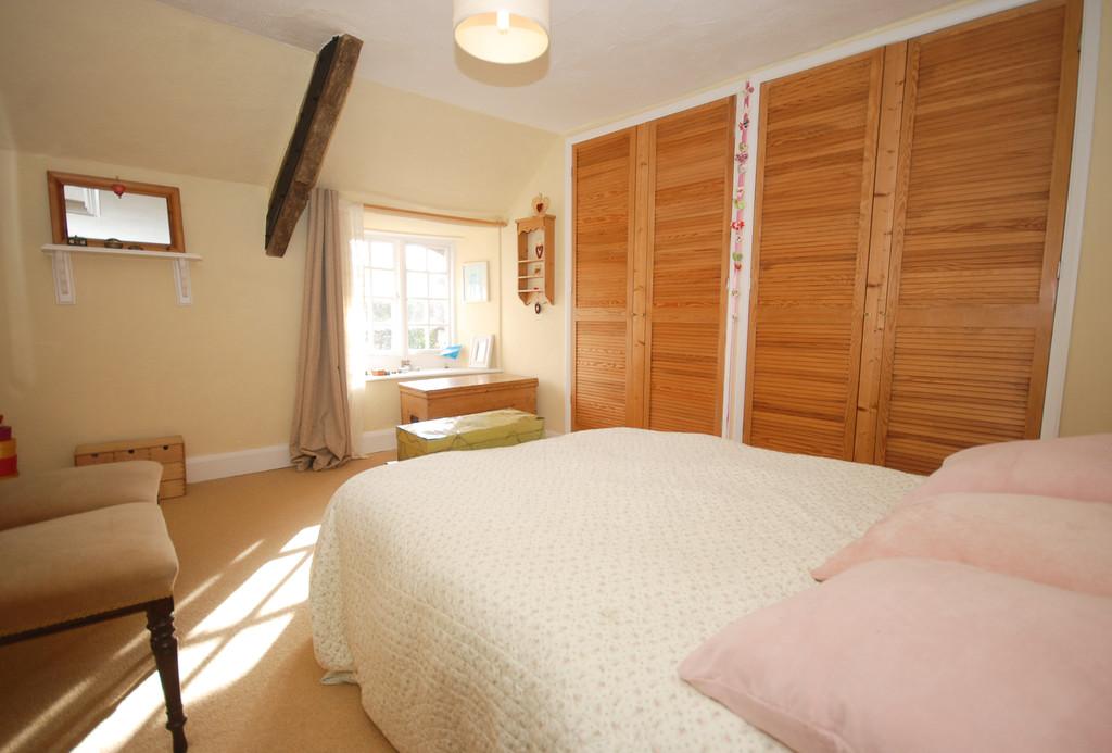 MASTER BEDROOM 4.03 x 3.93 (13'2" x 12'10") Reached via the 3rd bedroom/study, this large dual aspect room with original exposed beams and built in wardrobes, enjoys a large window seat to make the most of the views over the mature south facing garden.