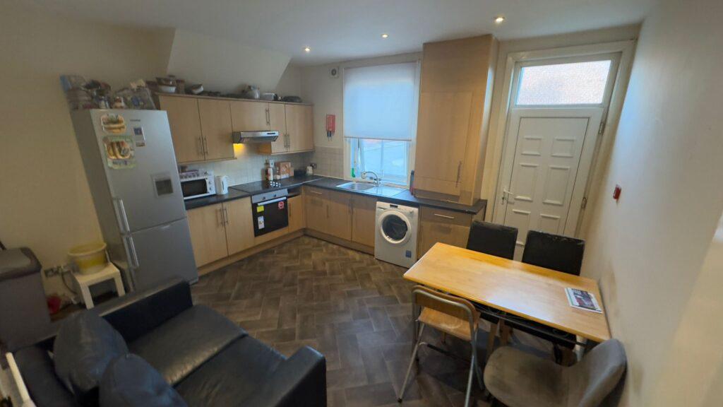 KITCHEN/DINING ROOM - Towards the back of the property is the spacious communal kitchen. The space is well-equipped with plenty of cupboard storage and counter-tops, an integrated oven/hob, extractor fan, washing machine, fridge/freezer and microwave. A dining table with chairs and sofa provides seating, and a window and external door provide light and ventilation.