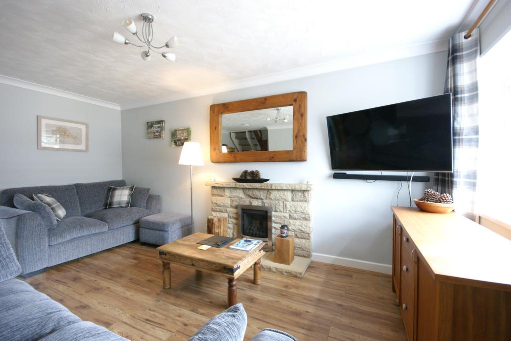 Accommodation consists of entrance porch with access door to garage. Open living area with stairs accessing first floor. Living room has feature stone fireplace with gas fire. Laminate flooring throughout. Leads to kitchen and dining area.