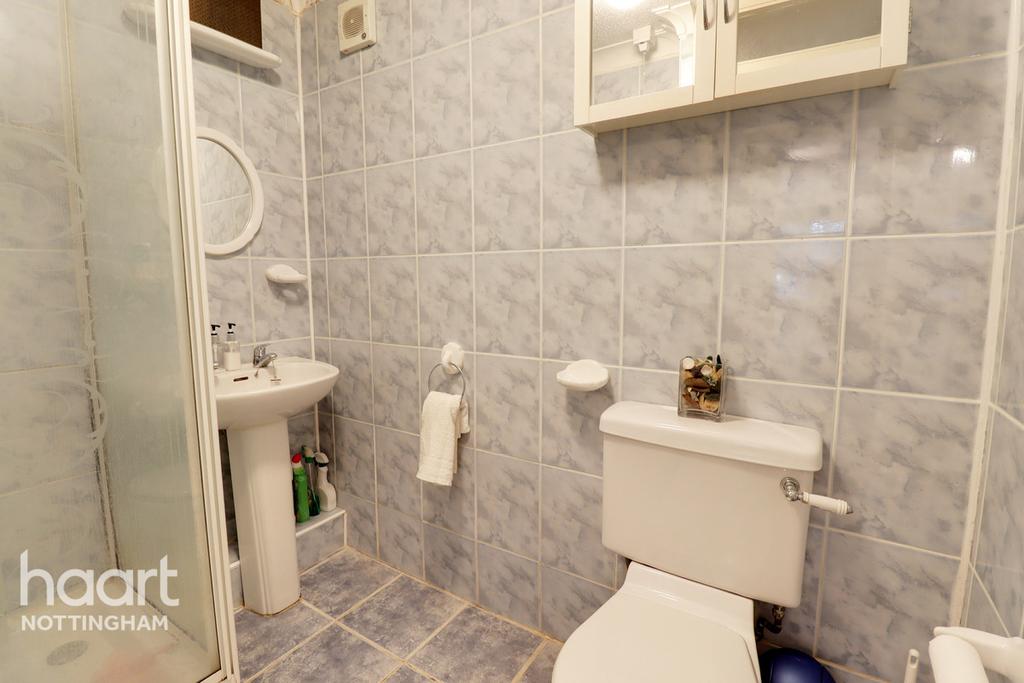 Three piece suite comprising of: shower cubicle, low level wc and pedestal wash hand basin. Tiling to walls and floor and radiator