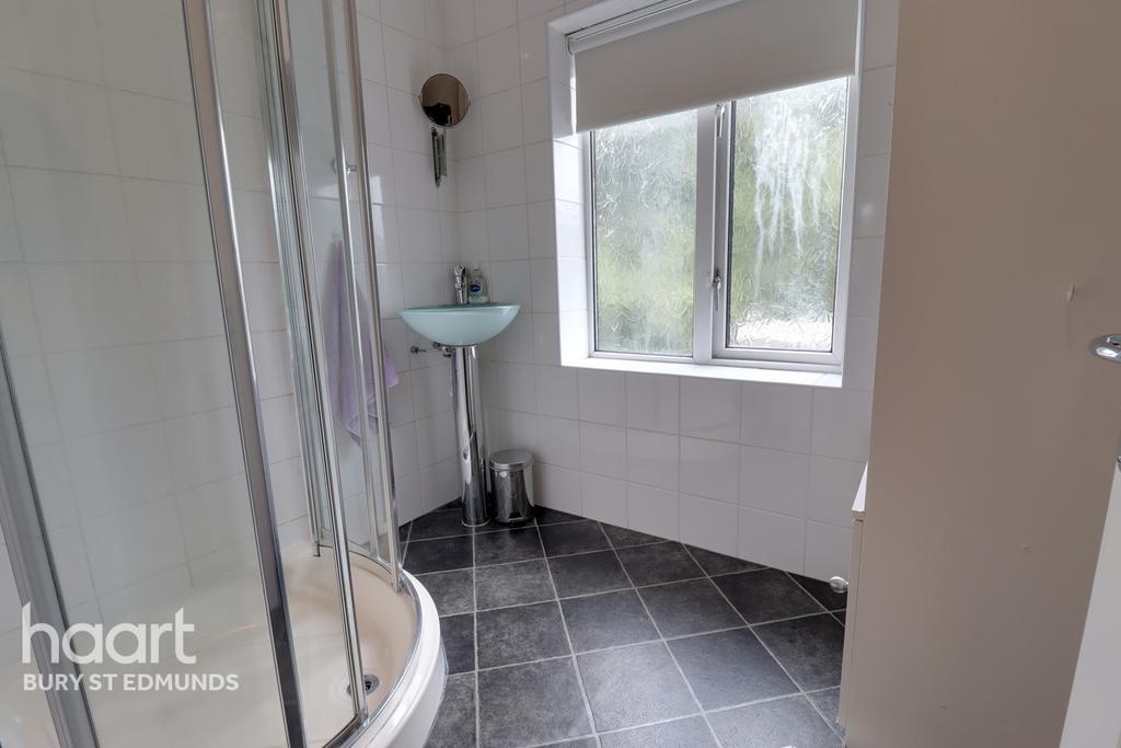 With suite comprising pedestal wash hand basin. Shower cubicle. Stainless steel heated towel rail. Window to rear aspect.