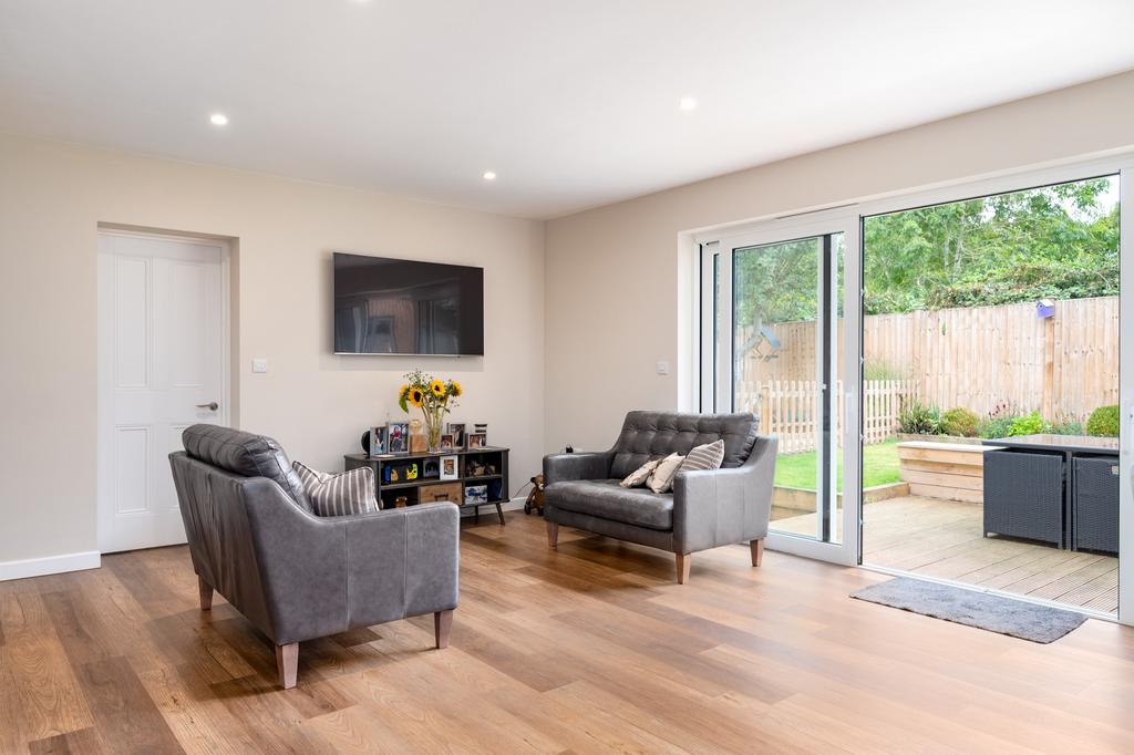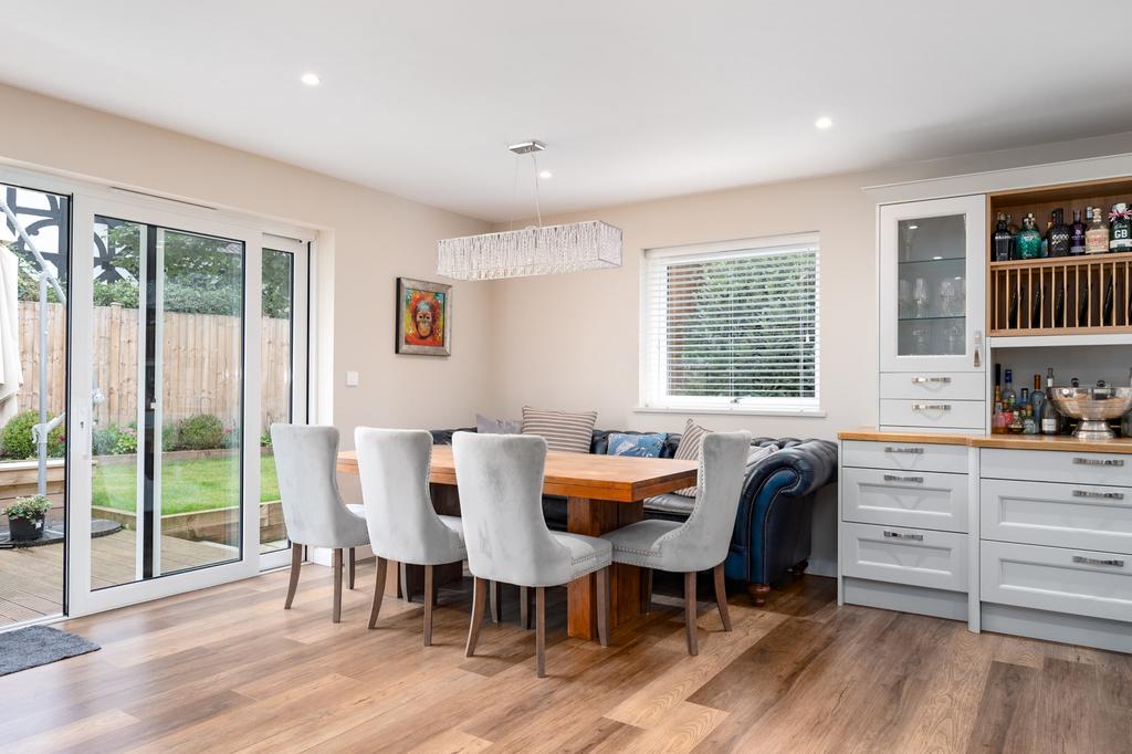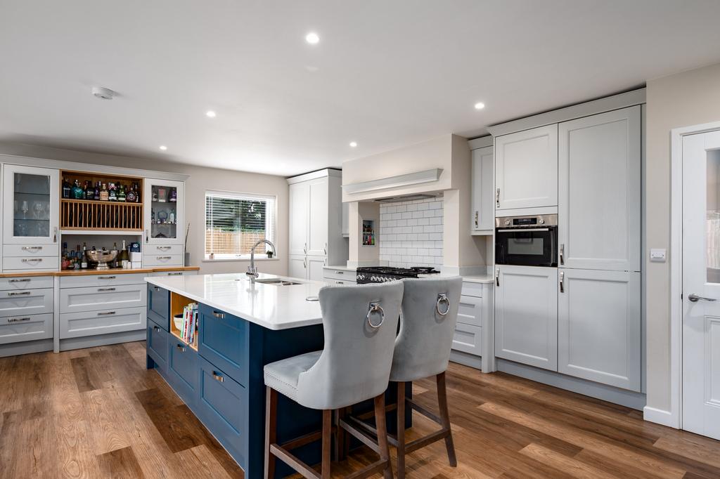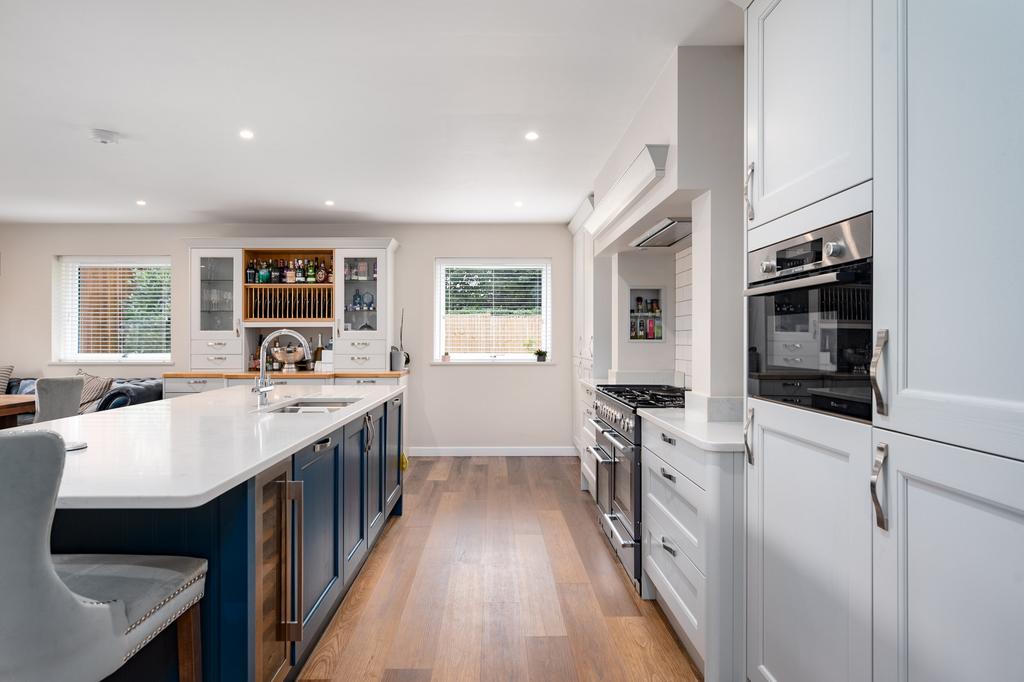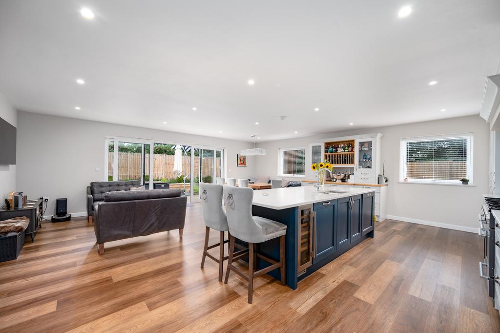 Open plan living room and kitchen - (7.06m X 6.67m) (23-1 X 21-8) A most spacious living area with recessed ceiling lighting, double-glazed windows to the side elevation and large double-glazed patio doors opening onto the rear garden. There is a fully fitted bespoke kitchen with an excellent range of storage cupboards with quartz work surfaces and integrated appliances to include a full height Bosch fridge, full height Bosch freezer, Bosch combination microwave and a freestanding Nexus range style cooker with six gas hob burners and hotplate and two electric ovens and separate grill. There is a central island with quartz work surface with an inset stainless steel sink unit with waste disposal and a mixer tap with filter and boiling water facility. Further storage units below and an integrated wine cooler and dishwasher.
