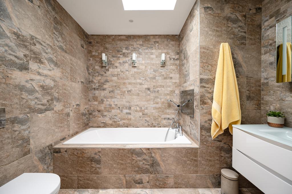Family bathroom - With matching floor and wall tiling, electric double-glazed Velux skylight window and fitted with a wc with concealed cistern, inset wash hand basin with drawers under and a bath with recessed flat screen television over.