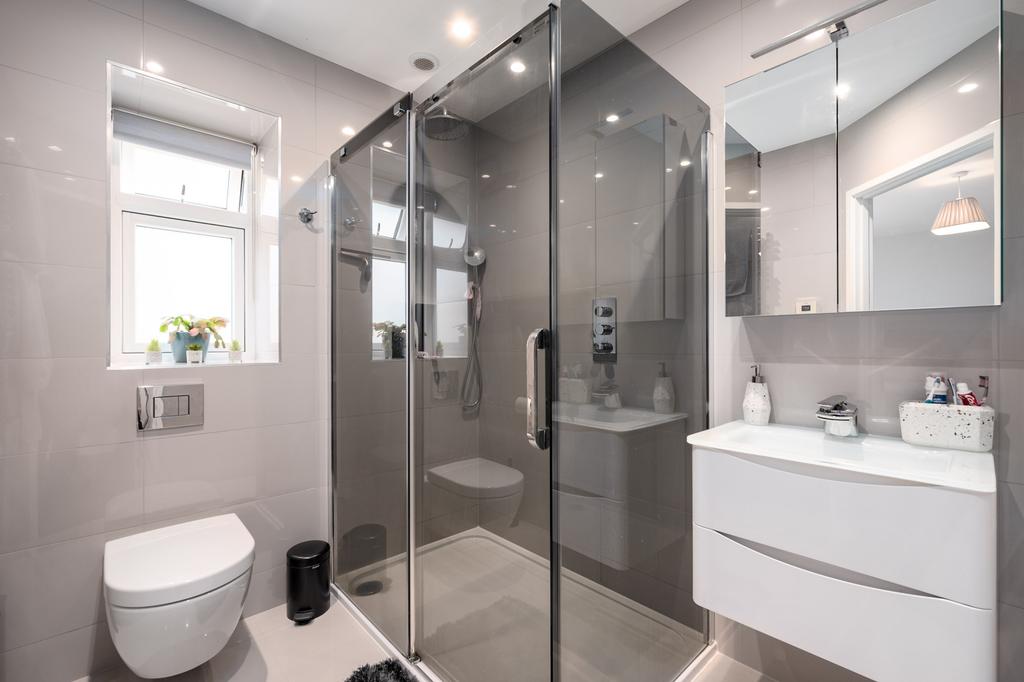 En suite - With matching floor and wall tiling and fitted with a wc with concealed cistern, wash hand basin and shower cubicle with screen door and rainfall shower head.