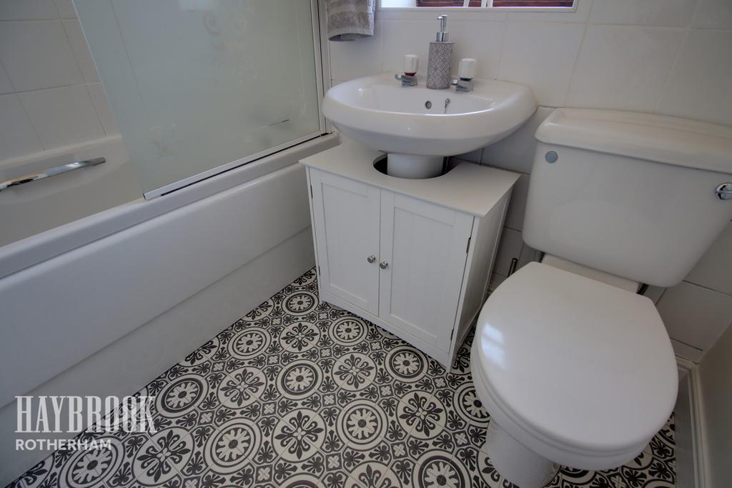 The bathroom is fitted with a wash hand basin with tiled splashbacks, a bath with shower over, a central heating radiator and a side facing PVCU double glazed window.