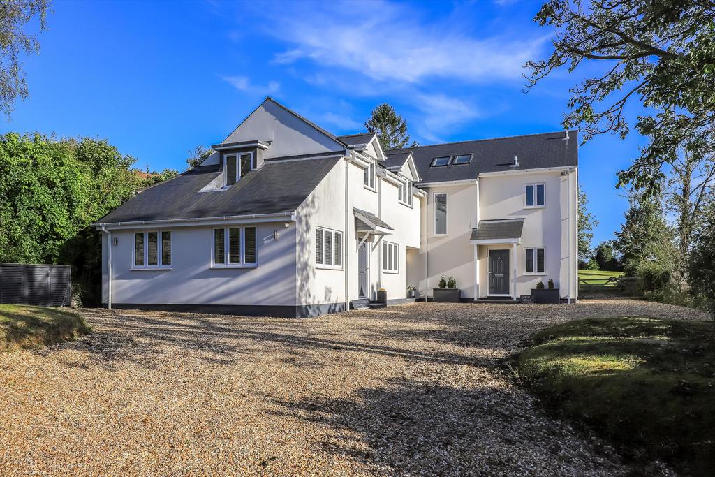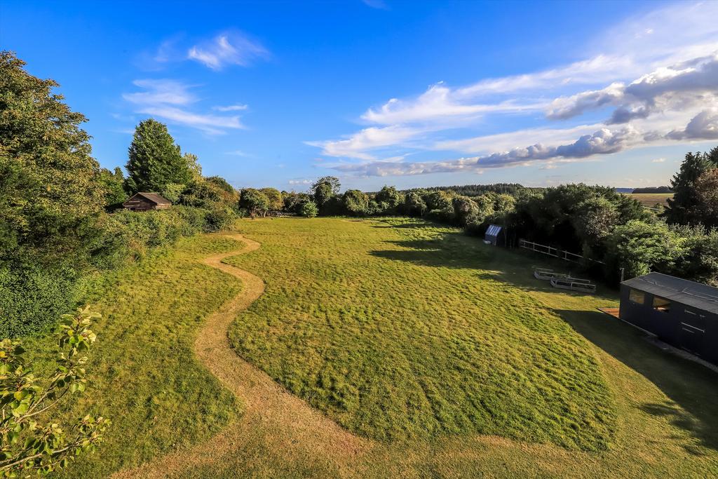 Upstairs, the principal bedroom benefits from south-facing views over the garden and paddock, an en suite bathroom and fitted wardrobes. Two further double bedrooms with en suite bathrooms, two additional good-sized bedrooms, and a spacious family bathroom.