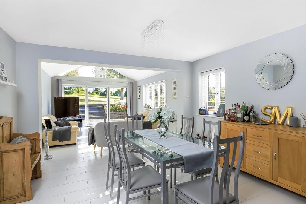 Welcome you into a spacious entrance hall with a door leading into the study and double doors into the dual aspect sitting room with French doors out to the garden terrace. The entrance hall also gives access to the impressive kitchen with a central island and breakfast bar, a modern handless kitchen designed with integrated appliances. The dining room is adjacent to the kitchen and leads immediately to the family room, featuring a vaulted ceiling and bi-fold doors to the garden terrace. A door of the kitchen leads into a second hall with a downstairs cloakroom and utility room with an additional entrance from the front of the property.
