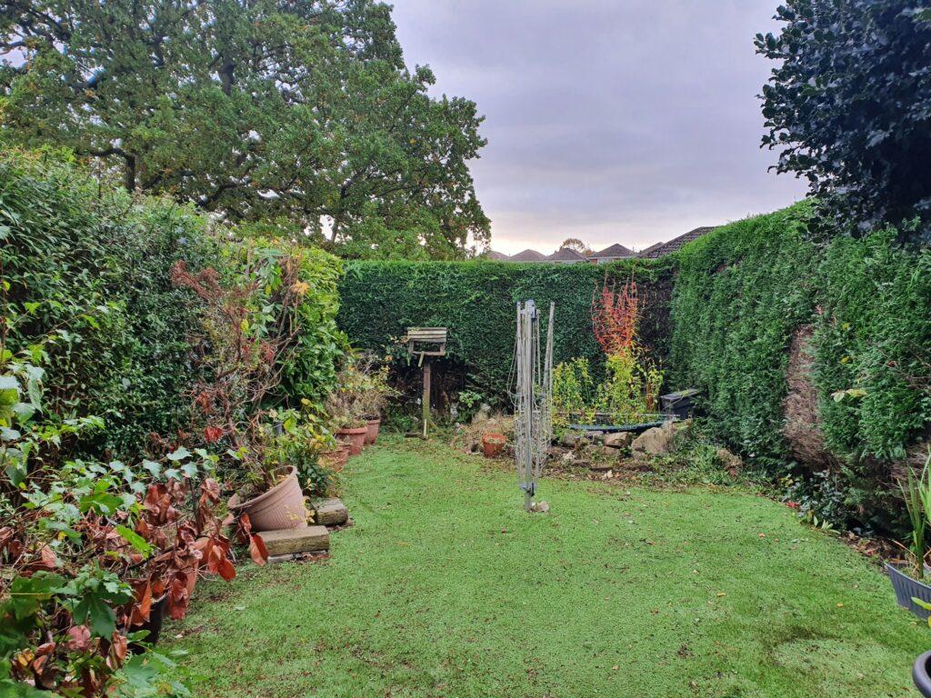 EXTERNAL - The rear of the property includes a large patio and lawned garden, perfect for relaxation and recreation and surrounded by foliage. A spacious shed can also be found, ideal for external storage. The front of the property includes a gravel driveway leading up to a single garage, and a small front lawn.