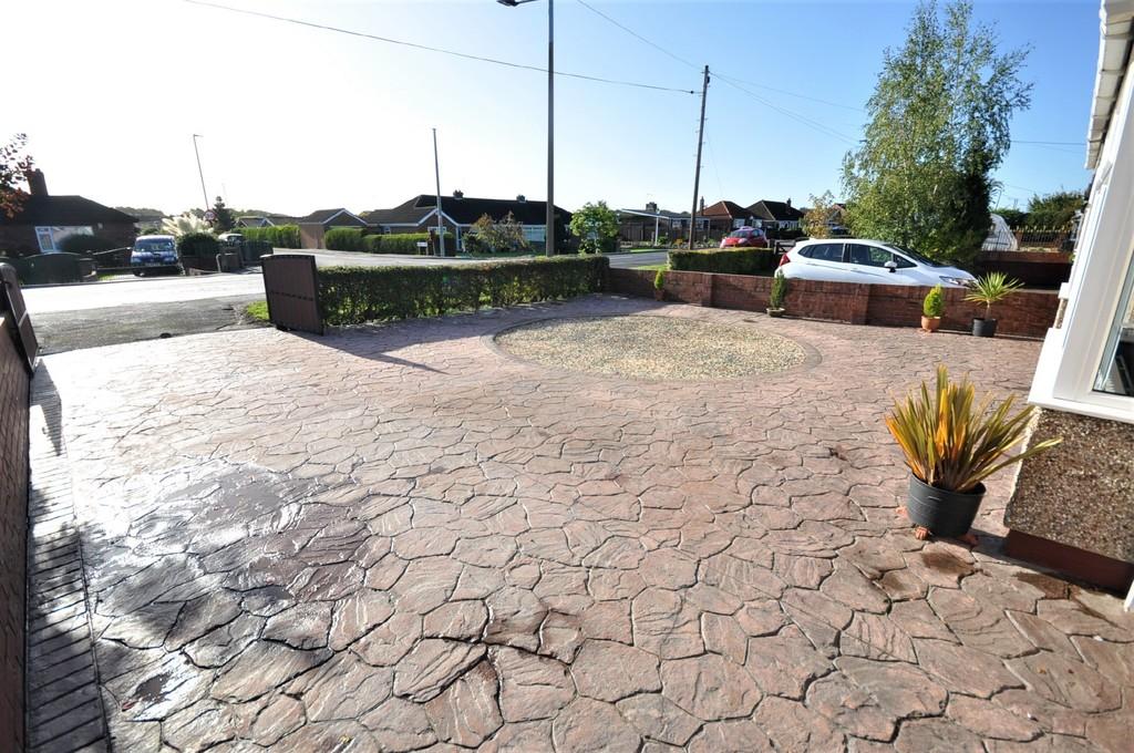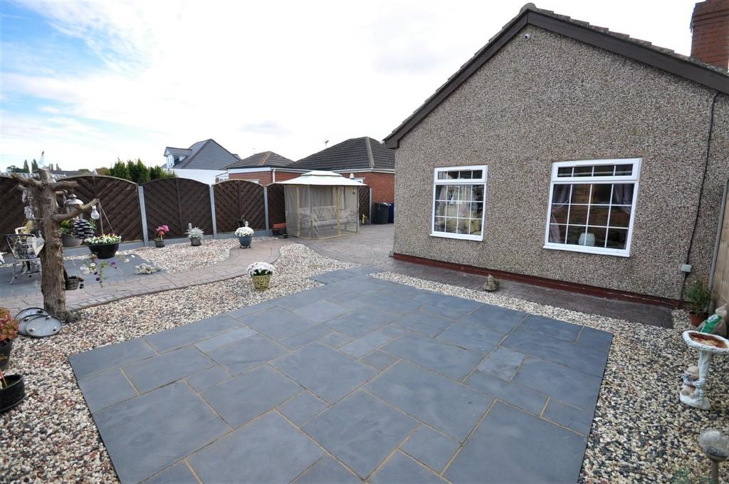 The patterned concrete driveway continues down the side of the bungalow and to the rear where it turns into a decorative winding path leading upto the garage entrance door. There are two stone paved patio seating areas, timber panelled fencing and gravelled borders.