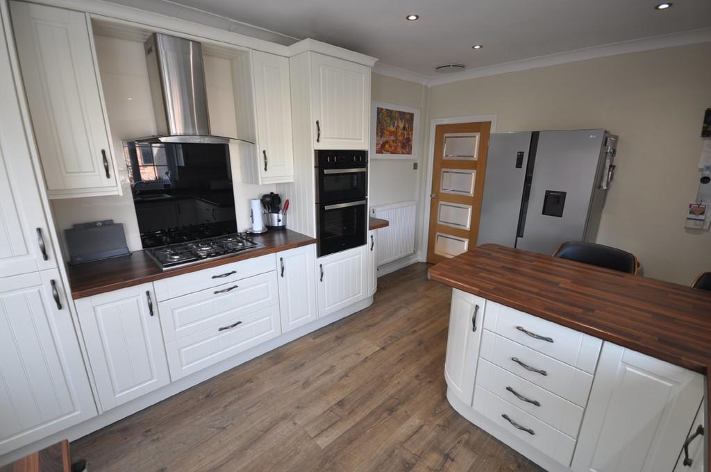 KITCHEN/BREAKFAST ROOM 14' 7" x 11' 3" (4.47m x 3.44m) Rear and side facing UPVC double glazed windows and side UPVC double glazed entrance door. Fitted with a range of shaker style cream wall and base units with walnut effect worksurfaces incorporating a one and a half bowl sink and drainer. Matching breakfast bar. Integrated five ring gas hob with extractor hood, electric oven and grill. Space for American style fridge freezer and integrated dishwasher and wine cooler. Concealed wall mounted 'Worcester Bosch' gas combi boiler. Engineered timber flooring. Radiator.