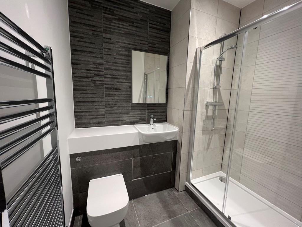 SHOWER ROOM Double sized shower cubicle, low-level WC with soft close toilet seat, wash hand basin, thermostatic shower LED mirror with shaver socket and demister function, towel radiator and tiled floor