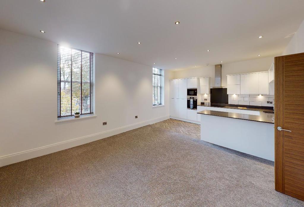 Open-plan living space, incorporating stylish kitchen. With dual aspect from three windows, the room is spacious and bright and ideal for entertaining. Media points in brushed chrome.