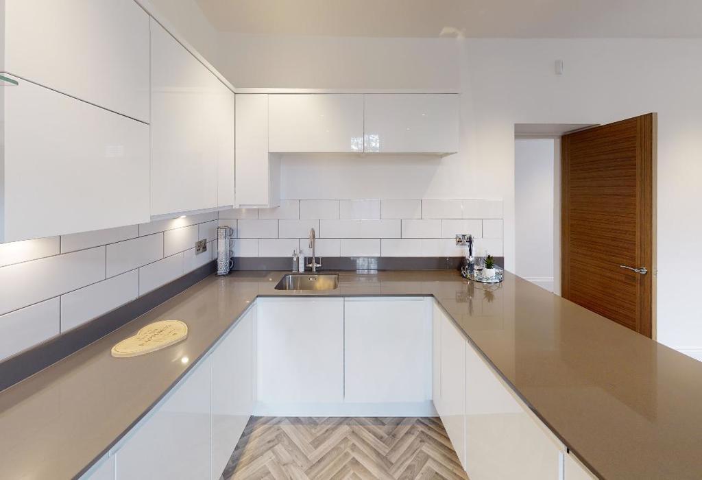 The integrated kitchen is fitted to a high standard with silestone work tops, breakfast bar which separates from the living space, high-gloss wall and base units. There are also integrated appliances: hob and oven, extractor fan, dishwasher and fridge/freezer.