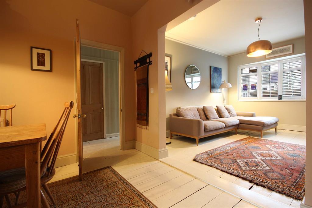 Opening through both rooms, original wooden floorboards painted white, wall-mounted radiator to side aspect, curved bay frontage with double-glazed windows behind shutters. Storage and shelving unit to side aspect next to chimney breast with feature fireplace on tiled surface, coving along ceiling. Additional storage and shelving unit to other side of chimney breast.