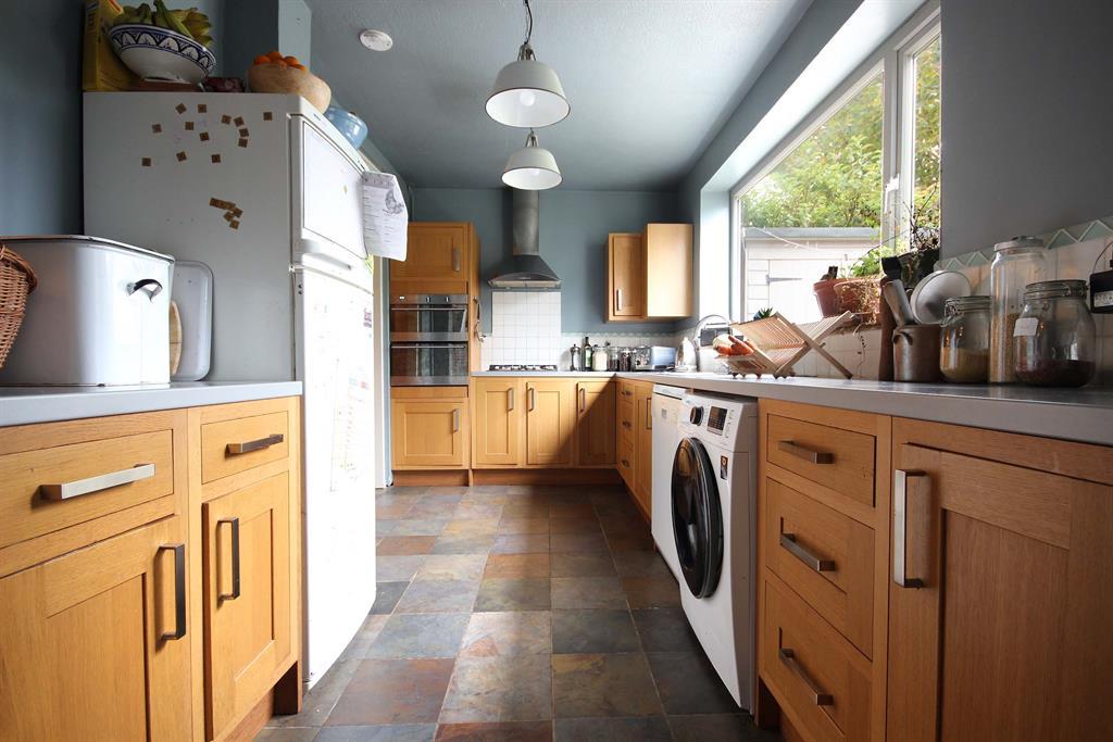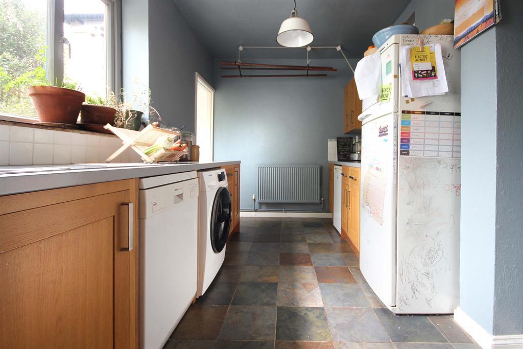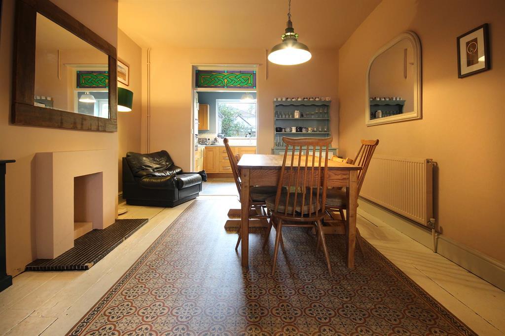 Tiled flooring, space for washing machine and dishwasher units. Worktops to rear, side and front aspect, partial splash back tiling along walls, wood effect cupboard storage to side, rear and front aspect. Stained glass window to front aspect looking through to office space. Additional stained glass window above opening to dining room. Cooker and cooker hood with splash back tiles to side aspect. Dual hot and cold tap with sink over drainer. Wall-mounted radiator to side aspect in kitchen and rear lobby giving access to rear garden via a PVC double-glazed, opaque door.