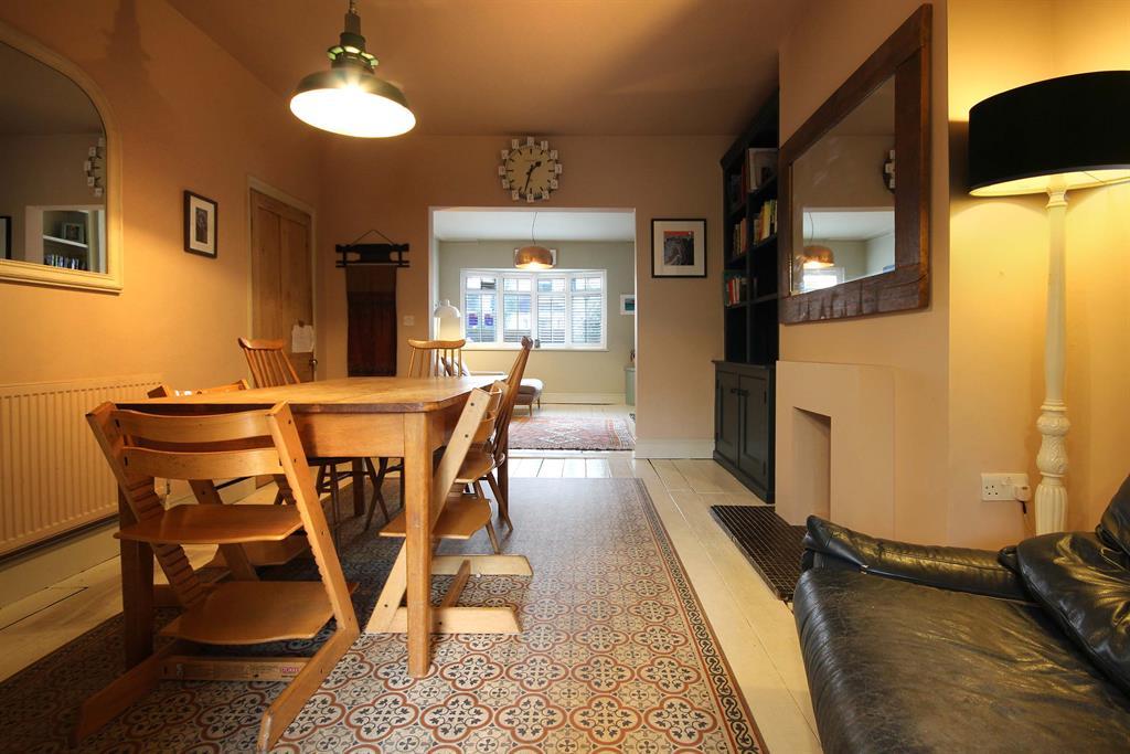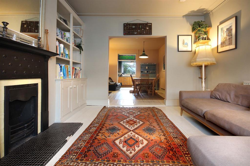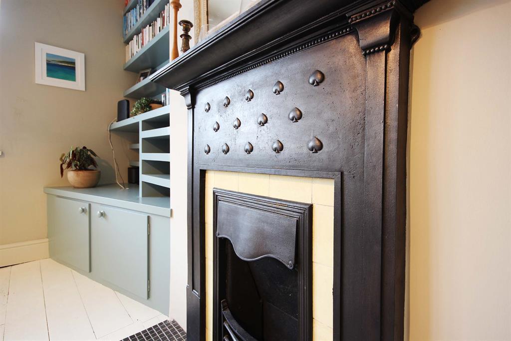 Original wooden floorboards painted white, chimney breast to side aspect with storage and shelving unit to the side of it to the front aspect. Chimney breast has open space below on tiled surface. Wall-mounted radiator to side aspect, opening to kitchen.