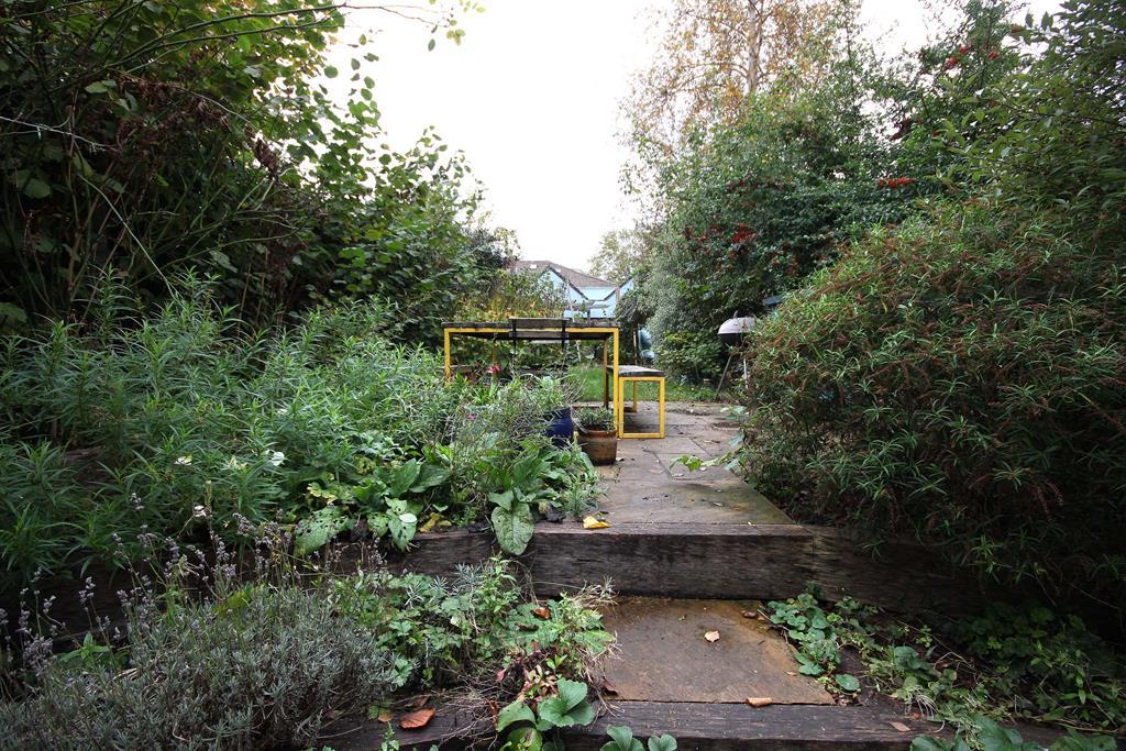 Stone slabs on surface, fencing and shrubbery to both side aspects, steps leading to further stone slabs before separated by lawn and shrubbery, followed by a bark covered surface with seating and crafted playground to rear aspect. Brick wall to rear aspect.