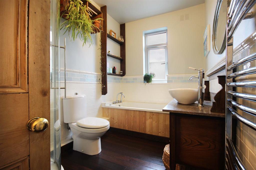 Wood-effect flooring, standing corner shower, contemporary toilet to side aspect, back-to-wall bathtub to rear aspect, oval sink over marble surface top with wooden cabinet beneath, dual hot and cold tap, splash back tiles along wall with ceramic dado-rail, PVC opaque window to rear aspect, towel rack wall-mounted radiator to side aspect. Accessed via wooden panel door.