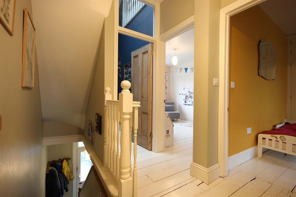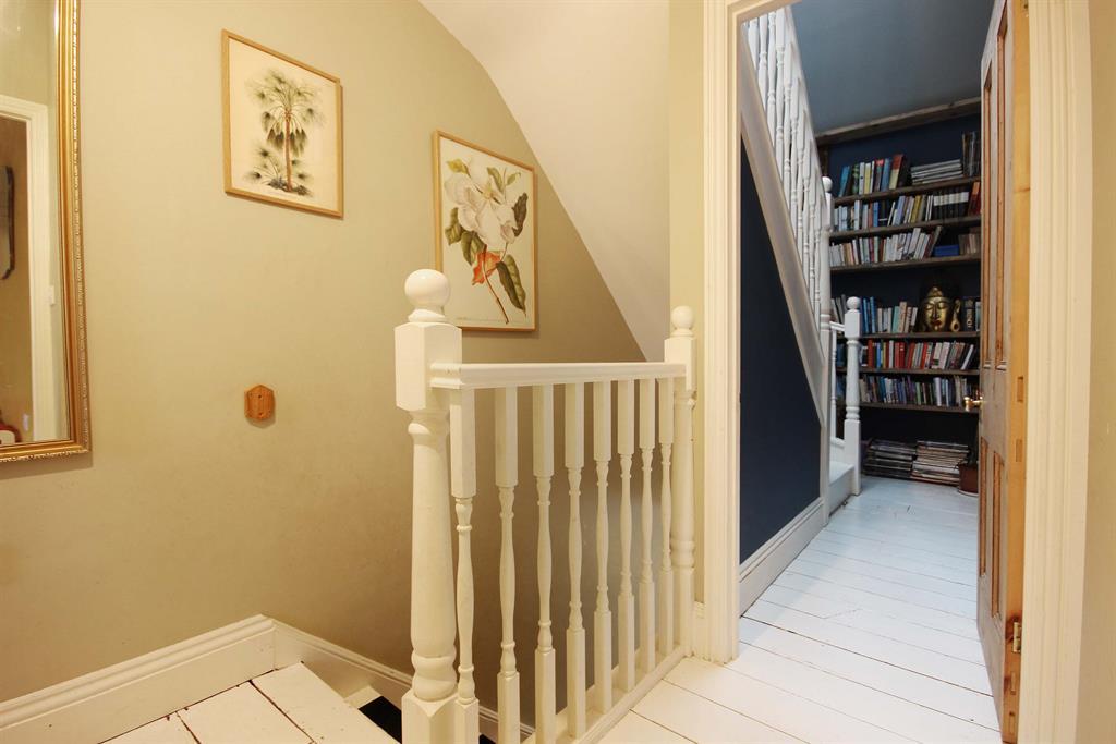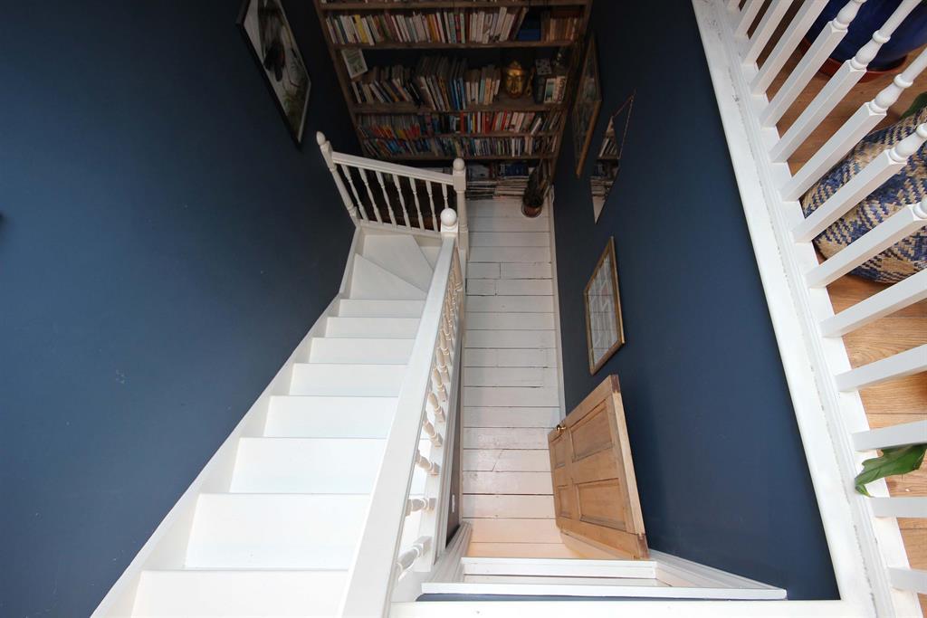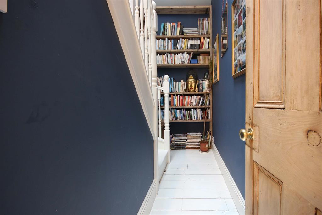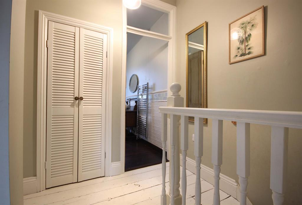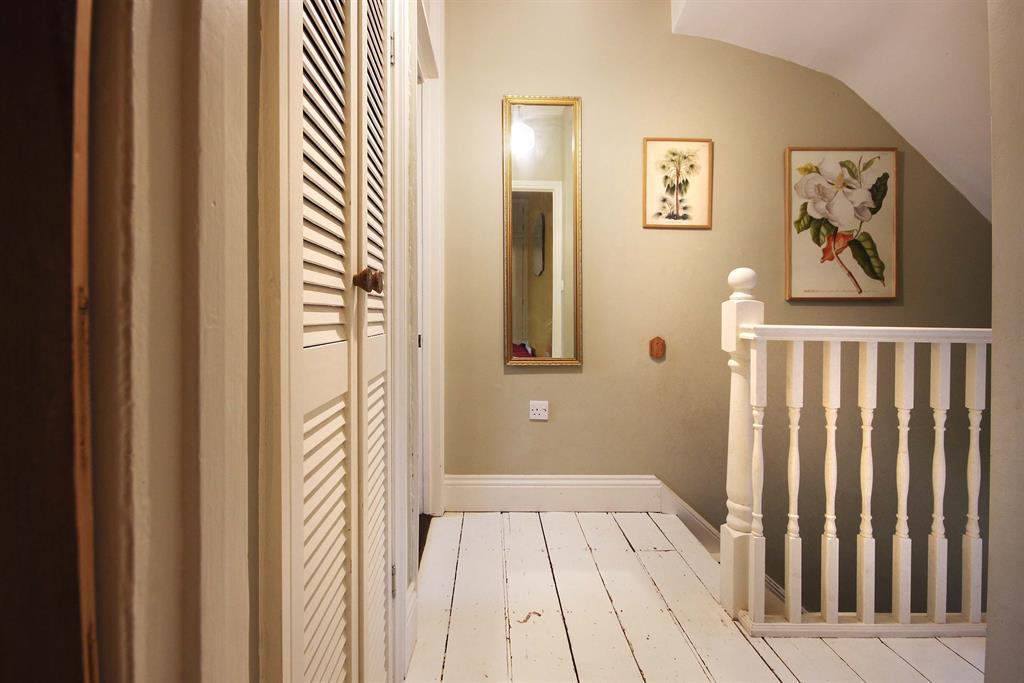 Original floorboards painted white, access to bedrooms, bathroom and second floor. Shelving unit to front aspect, shutter doors with access to integrated storage cupboard to rear aspect.