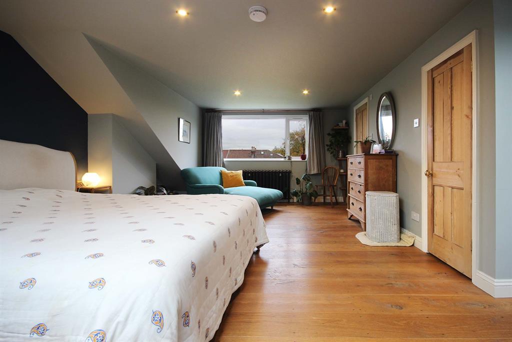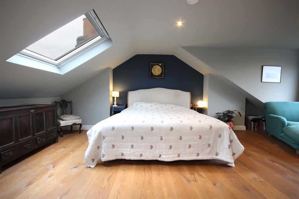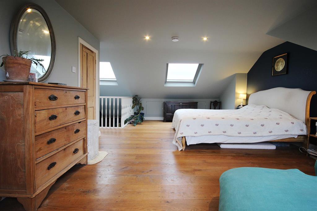 Wooden stairs and balustrade painted white, two double-glazed Velux windows to front aspect, hardwood engineered flooring, storage space in eves to front aspect, cast iron radiator to rear aspect, UPVC double-glazed window to rear aspect. Integrated wardrobe accessed via wooden panel door. Ceiling spotlights.