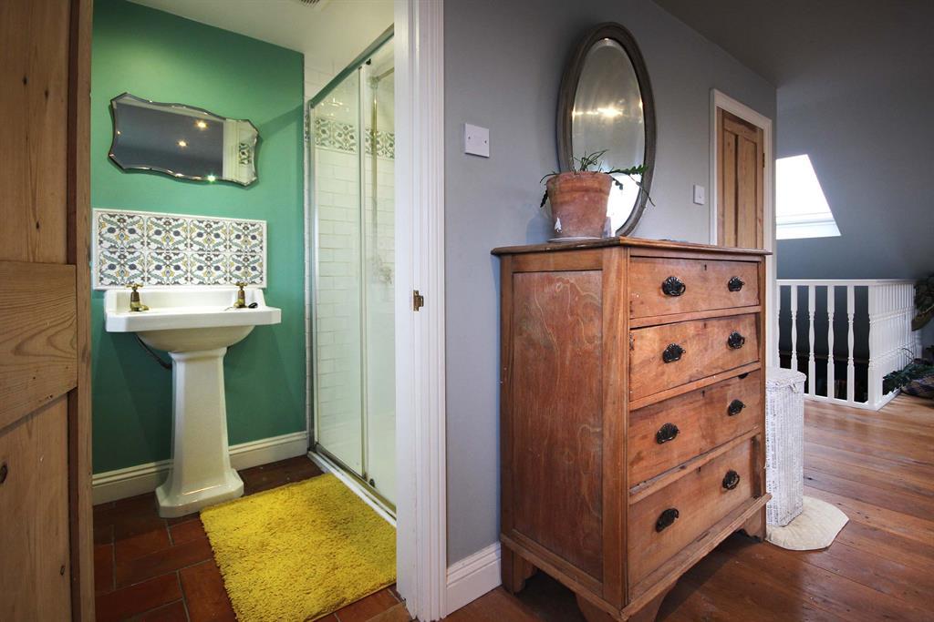En suite: Accessed via wooden panel door, brick red tiled flooring, standing shower to side aspect, Period style toilet to rear aspect and sink over pedestal to side aspect, hot and cold taps, UPVC double-glazed window to rear aspect, towel rack radiator to side aspect, splash back tiles above sink.