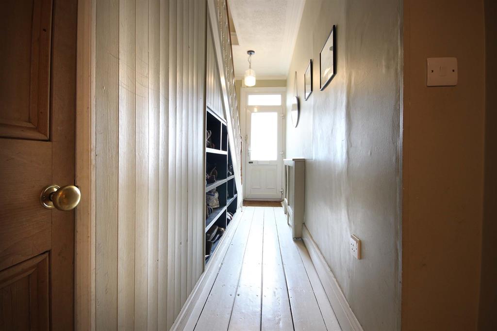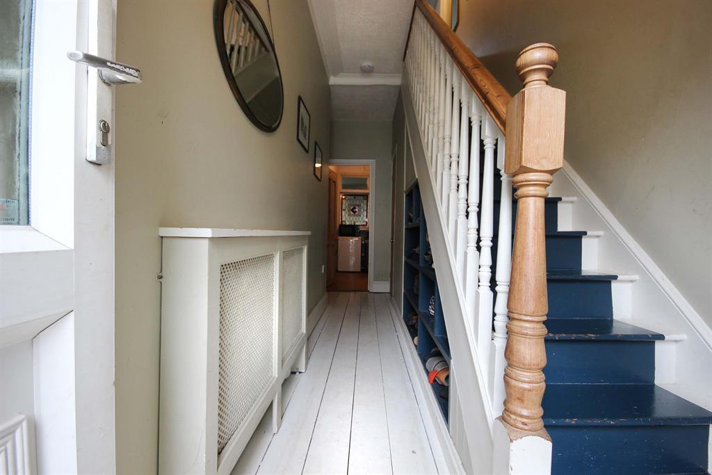 Accessed via UPVC/ opaque double glazed door with, original wooden floorboards painted white, feature box over wall-mounted radiator to side aspect, wooden staircase and wooden balustrade leading to first floor. Storage space under stairs with wooden panels along staircase, access to office space and living/ dining room.