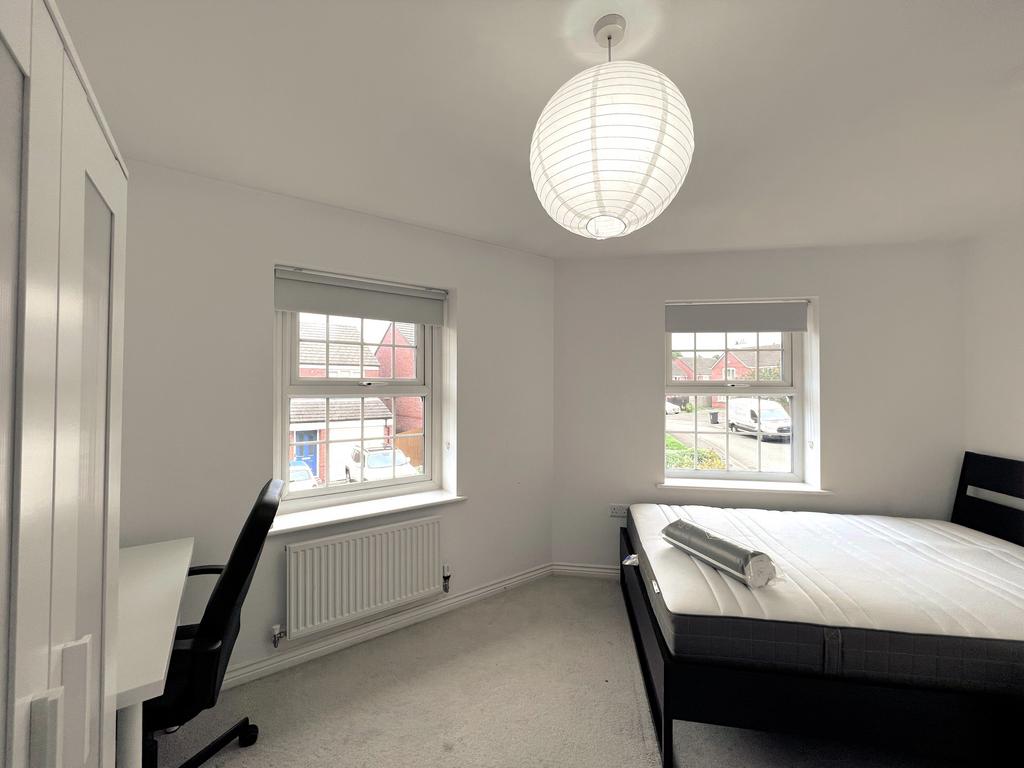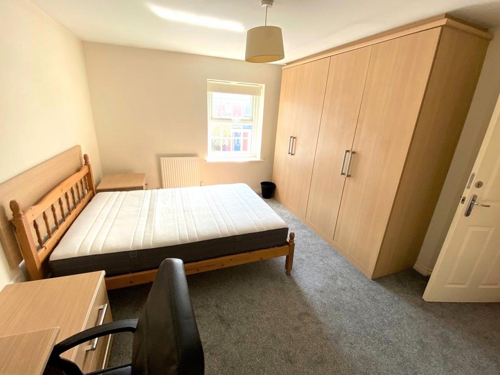 Downstairs double bedroom with bed, wardrobe, desk and drawers.