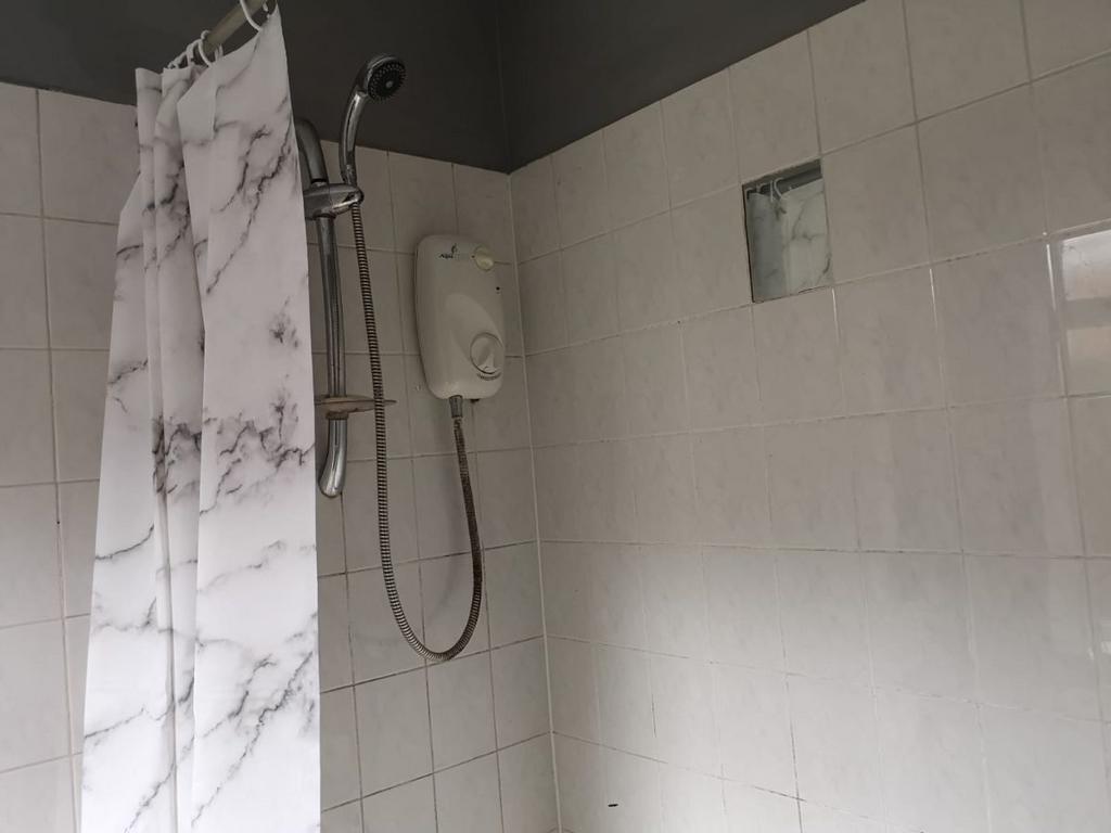With a white bath, sink, and toilet and over bath electric shower. Grey modern decore and a large double glazed frosted window.