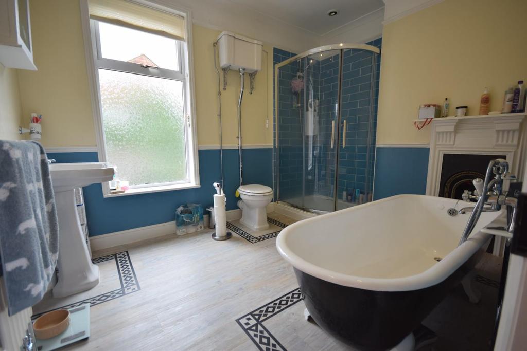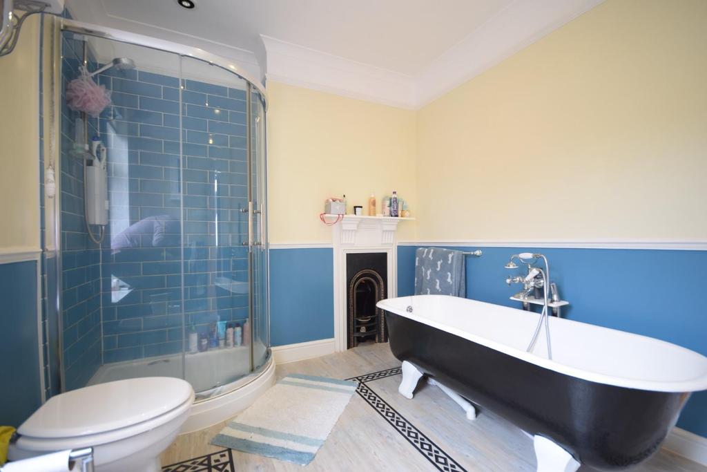 Family Bathroom - 3.05m plus inset x 2.51m (10'0" plus inset x 8'2" - This generous sized family bathroom offers you plenty of character at its best with all modern living, benefiting a double corner shower unit with electric shower over complimented with splash back tiling to water sensitive areas, pedestal hand wash basin, feature high level WC, roll top freestanding bath complimented with mixer tap and shower head, offering spotlights to ceiling, coving, picture and dado rail, column heated towel rail, feature fireplace and finished with wood effect flooring.