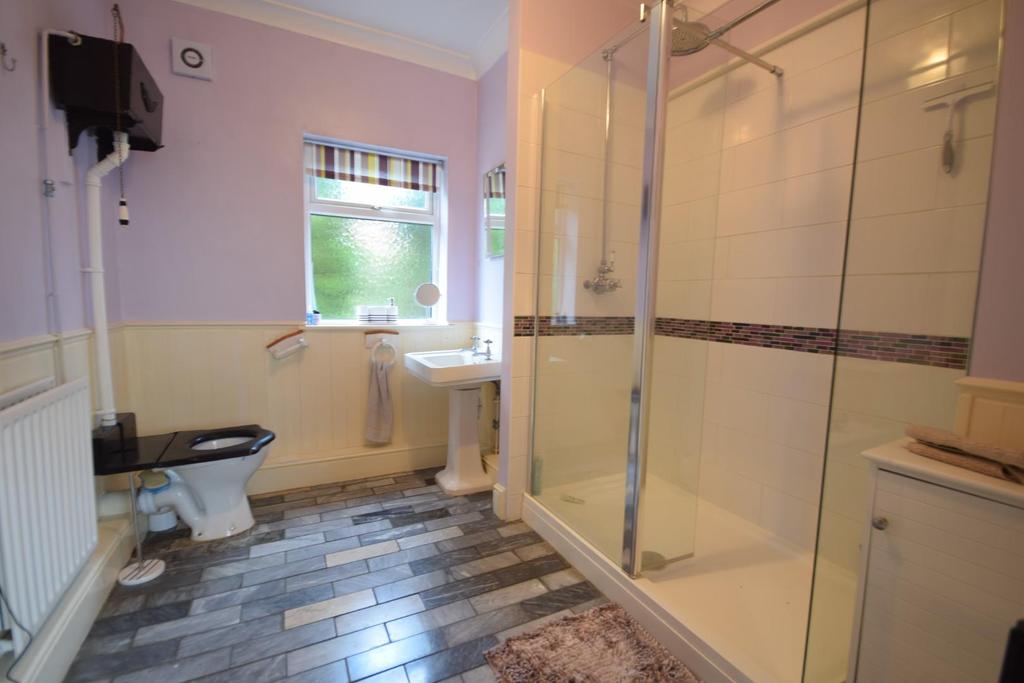 Downstairs Shower Room - This wonderfully refitted downstairs shower room offering a feature high level WC, double shower unit with high quality rainfall mixer shower, pedestal hand wash basin, all complimented with a feature tiled floor, UPVC obscure double glazed window to the rear.