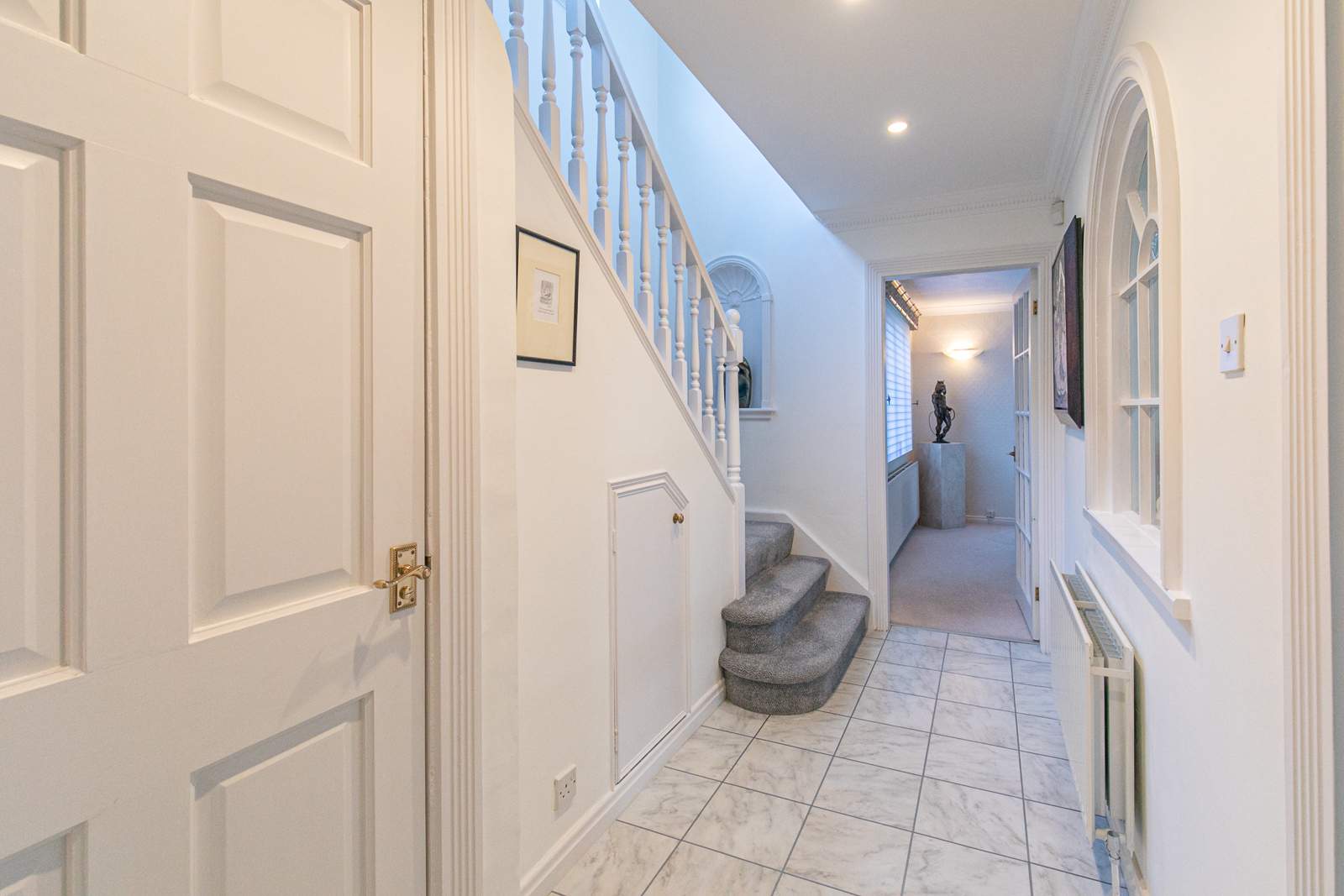 WEST WING Inner Hallway. Turn staircase to first floor. Understairs storage cupboard. Karndean flooring.