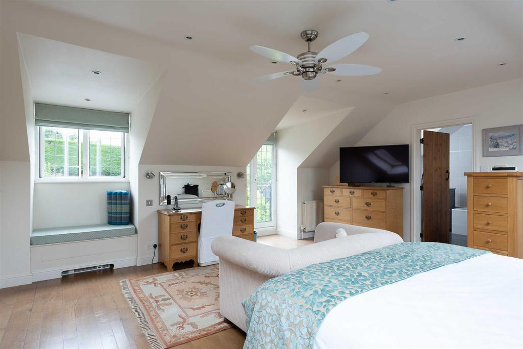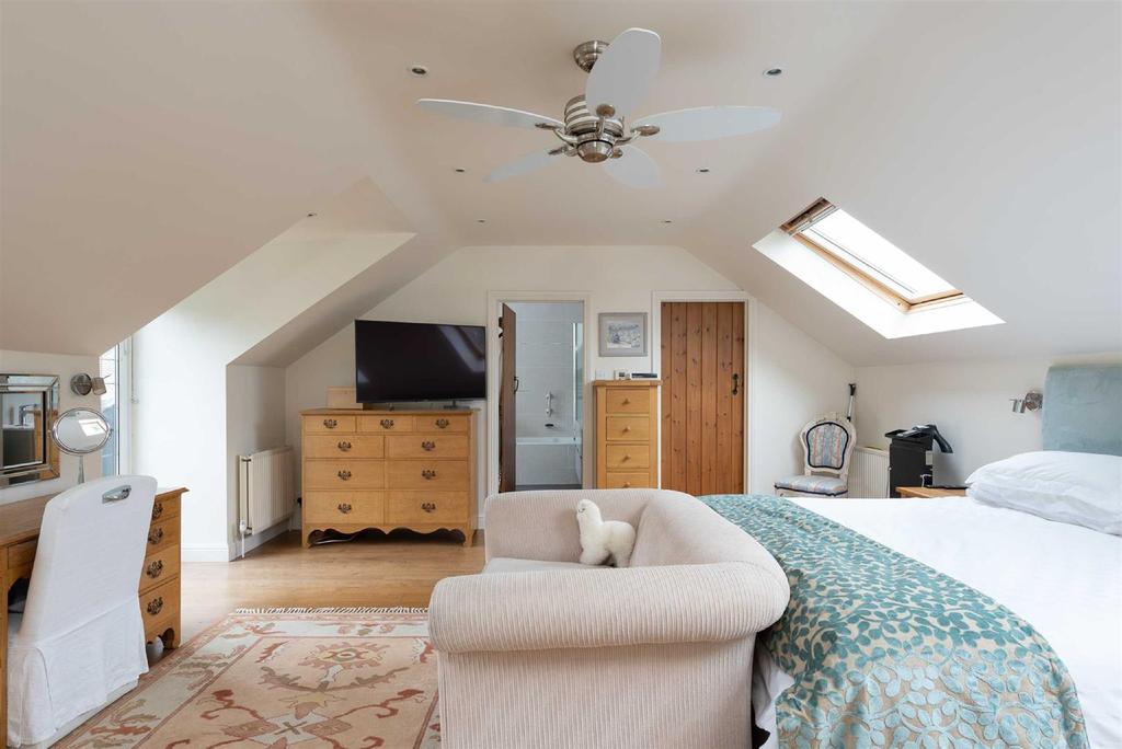 Bedroom: - 19'4 x 16'4 - Two Velux windows. Double glazed window to rear aspect. Double glazed doors to Juliet balcony. Solid oak flooring. Two double panel radiators. Fitted wardrobes. Doors to en-suite and dressing room.