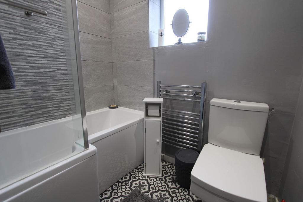 2.37m x 1.86m (7' 9" x 6' 1") Tile flooring and partly tiled walls, vanity sink with fountain mixer tap and tile backsplash, mirrored storage cabinet, W/C, heated towel rail, bath with shower above and side elevation frosted double glazed window.