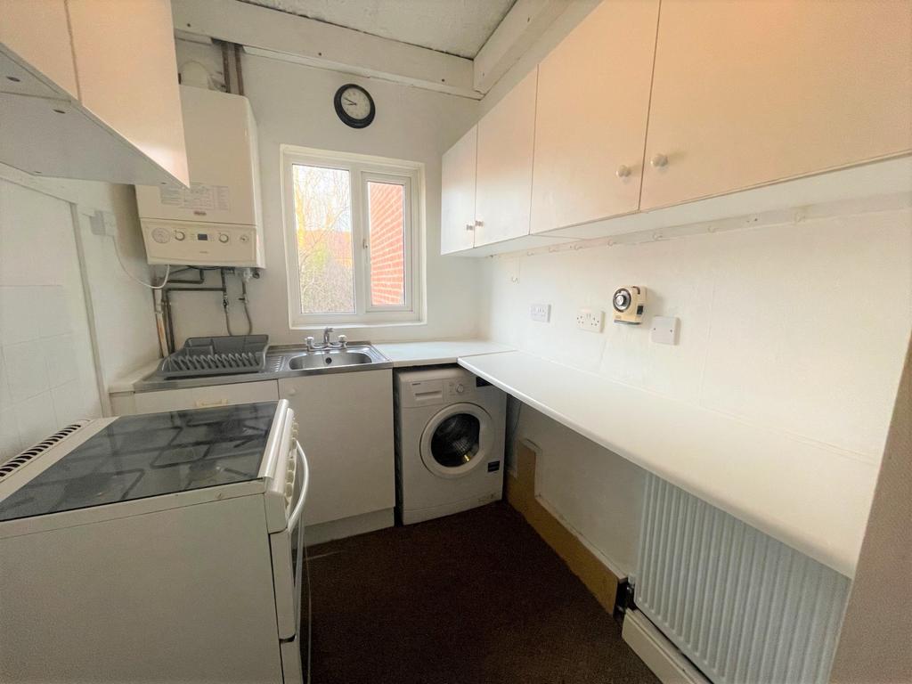Kitchen - White through out with rolled over edge work surface, vinyl flooring with room for a washing machine and small fridge freezer. Electric hob and oven. Double glazed window to the rear aspect of the property.
