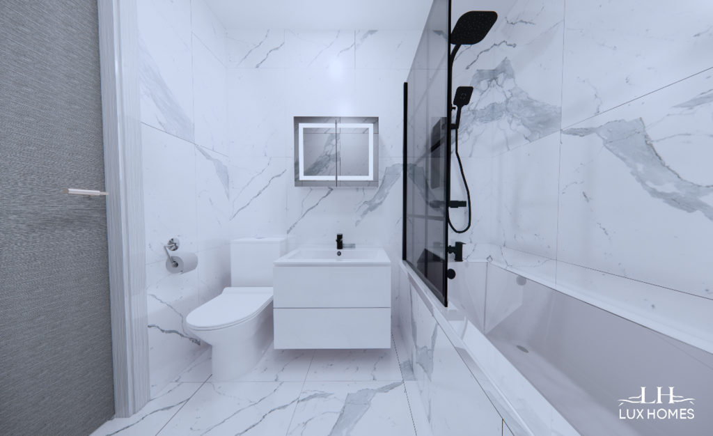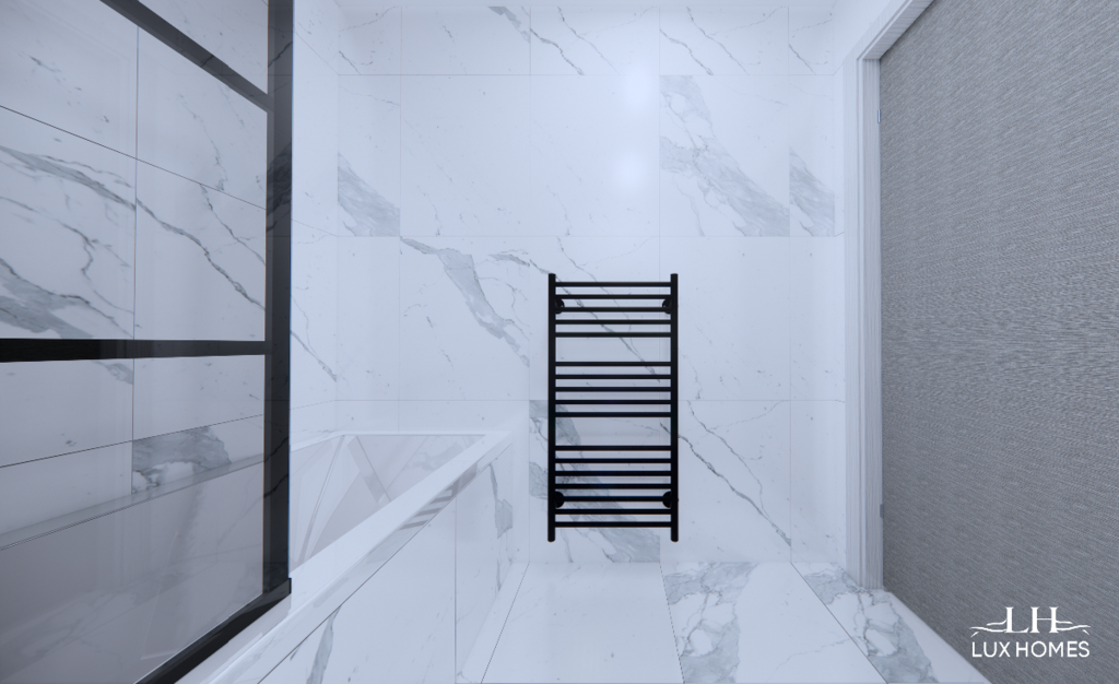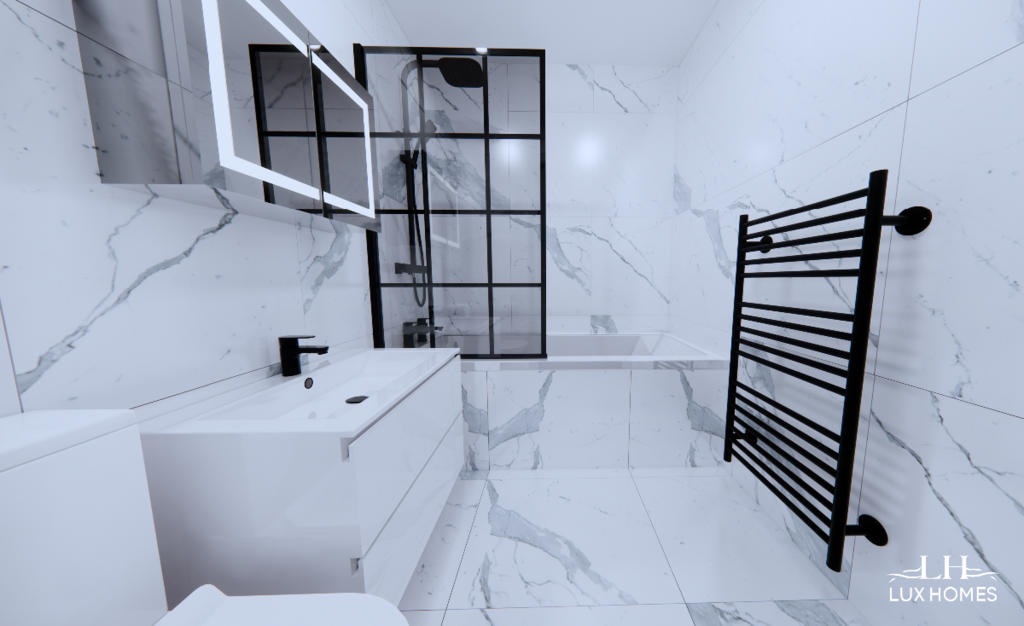 The bathrooms are finished with ultra modern marble design tiles throughout with white washbasins, Methven black taps and black shower fixtures with windowpane style shower screens with black accents all complemented with black heated towel radiators.