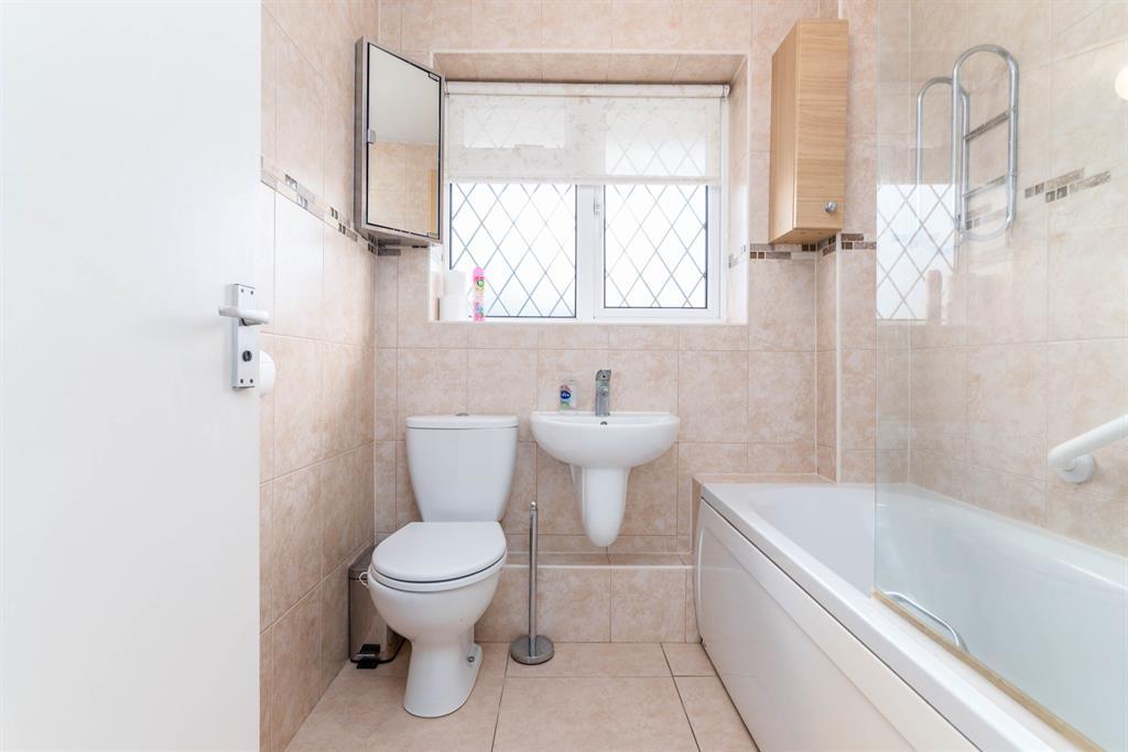Tiled floor with window to rear aspect. Bath with shower over, hand wash basin and toilet.