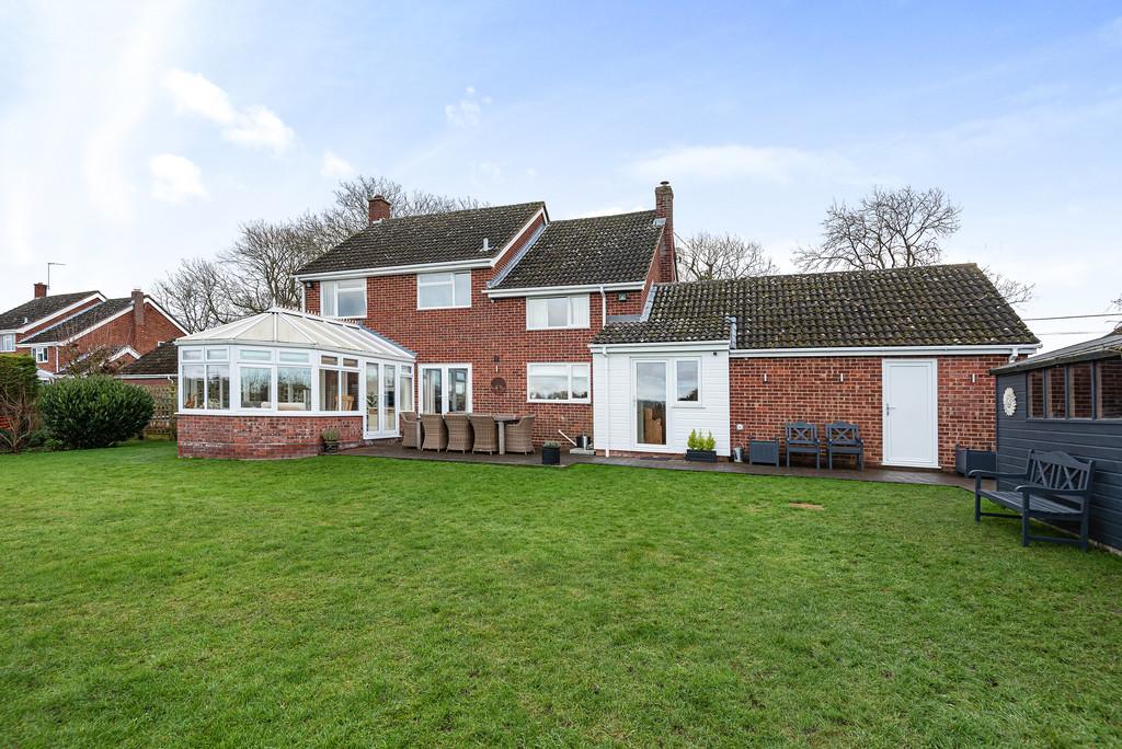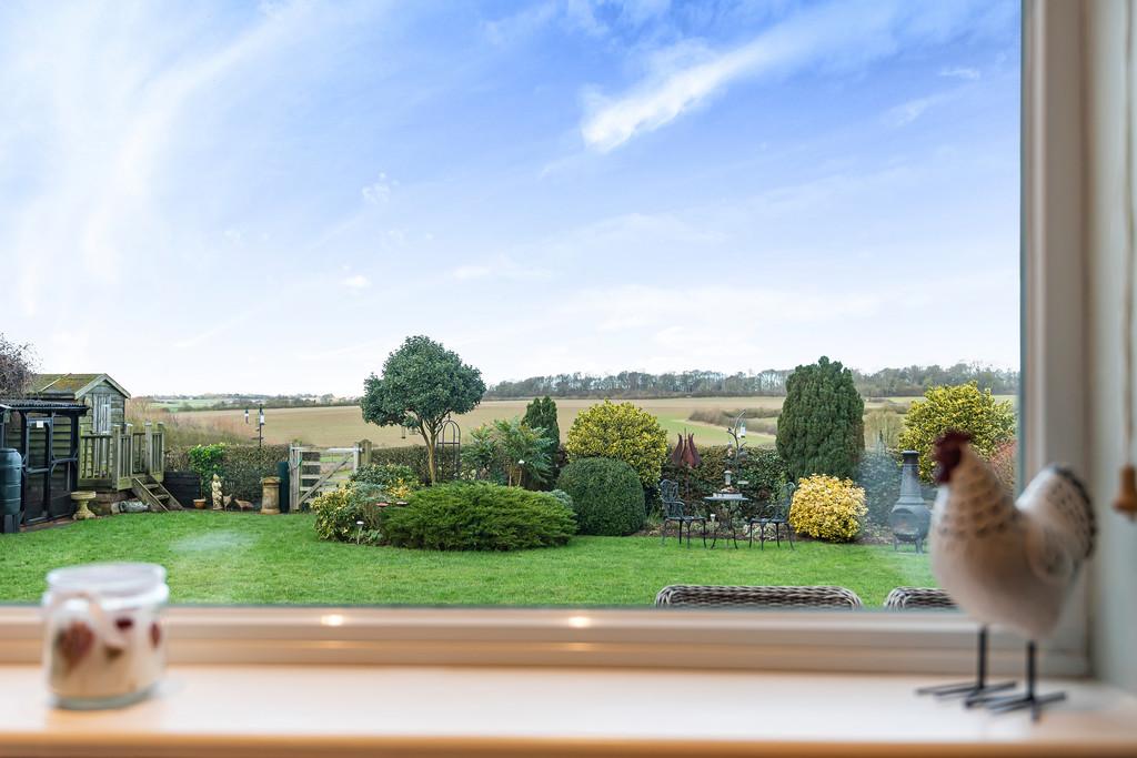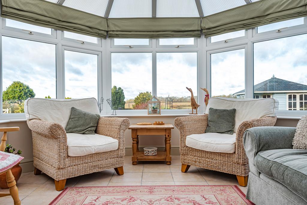 The reception hall has an under stairs cupboard and access to the cloakroom. There is a glazed door leading into the extremely spacious 'L' shaped main reception room which has a coal effect gas fire and ample space for sitting and dining room with two sets of French doors leading out, one to the sunny west facing terrace and the other leading into the spacious double glazed conservatory which has under floor heating and fitted window blinds. There is a naturally well lit spacious study ideal work from home space. The cloakroom/shower room has a corner shower cubicle, W.C, wash hand basin and is in beautiful condition throughout. The kitchen/breakfast room has been well maintained with a ceramic floor, one and a half bowl sink unit, stunning views across the garden and countryside beyond with four ring hob, Neff double oven, space for fridge freezer and fitted dishwasher. The utility room has space for washing machine, Boulter oil fired central heating boiler, access front and rear to the garden, space for a further freezer and ample storage cupboards.