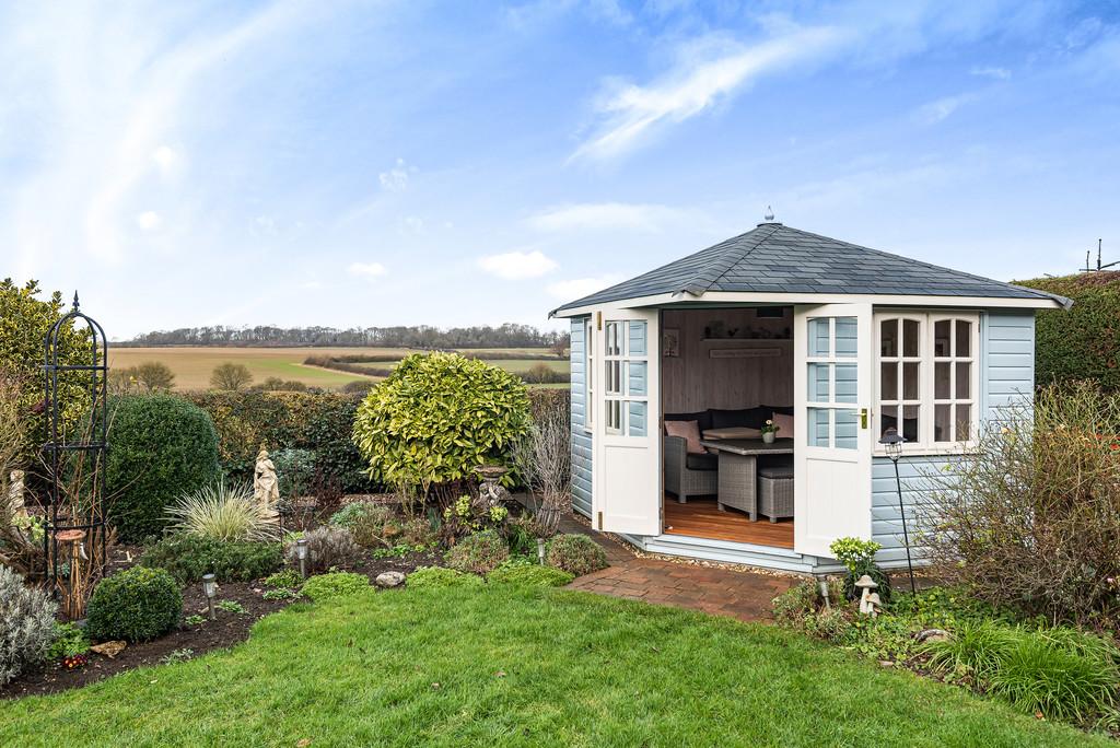 Outside The property is approached via Church Lane onto a roadway which provides access to three houses. The property is set well back from the road with concrete parking in front of the garage and shingle parking area, wide sweep of lawn with shrubbery, Conifers, Magnolia etc. There is a side gate leads past the garage and the oil storage tank to the rear terrace, timber shed 9' b y 12'. There is a covered outside terrace area, small enclosed chicken run and a play shed. A gate leads through to a large level area of paddock which is currently leased. There is a wide sweep of lawn bounded by shrubbery, Conifers etc. overlooking this is a timber framed garden summer house. To the side of the property is a further set of double gates which lead into a shingle storage area, vegetable growing area, log store and a further timber storage shed.