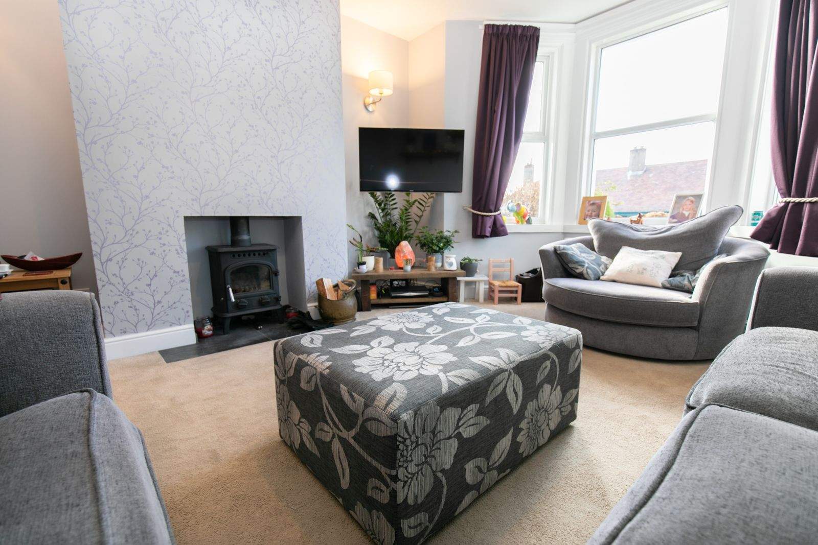 LOUNGE (approx 14'5 x 12'8) Feature uPVC double glazed walk in bay window. Feature cast iron wood burning stove set on a slate hearth. Television point. A clear opening provides access into: