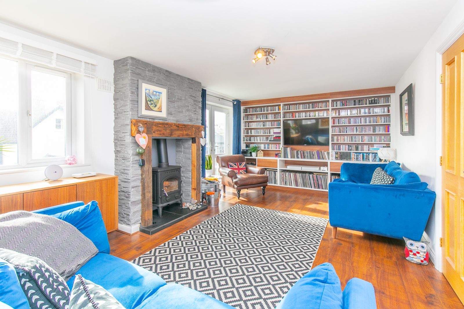 LOUNGE (approx 20'2 x 12'2) A stunning rear facing reception room with feature cast iron multi fuel burner set on a tiled hearth with high timber mantle and surround. Twin uPVC double glazed doors provide access onto the raised sun terrace which enjoys day long sunshine and provides a perfect place to watch the sunset. Custom made recessed shelving unit with storage below. Television point. Telephone point. Satellite point. Wood effect flooring. uPVC double glazed window providing distant rural views.