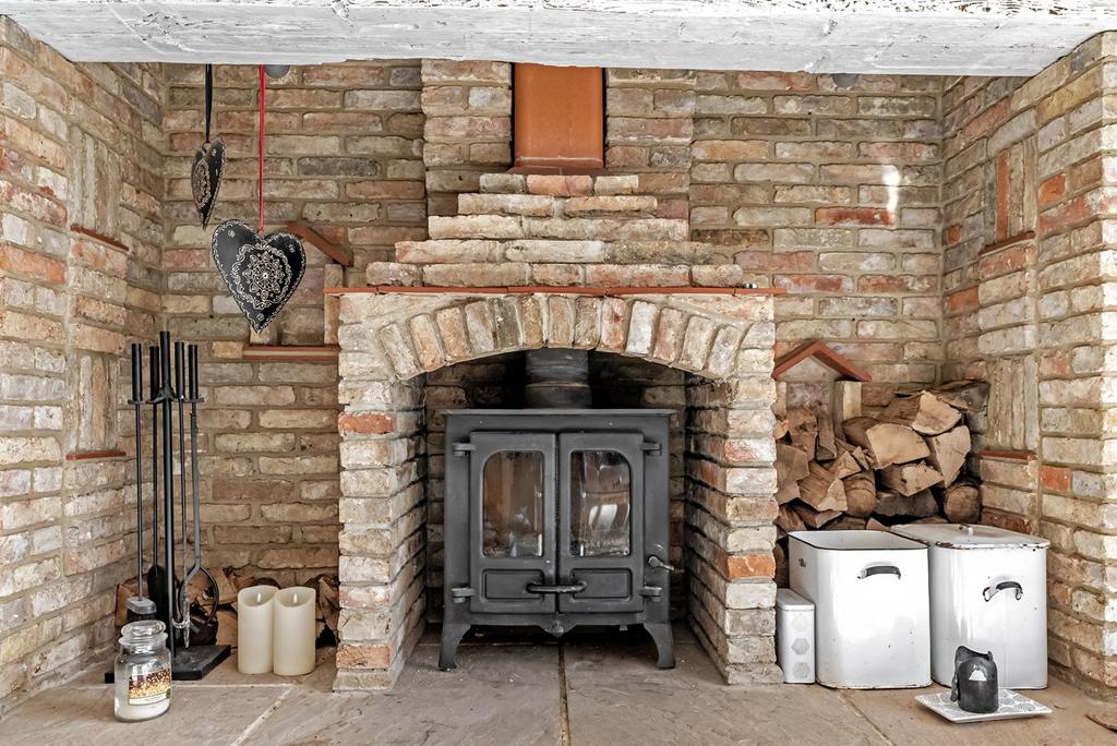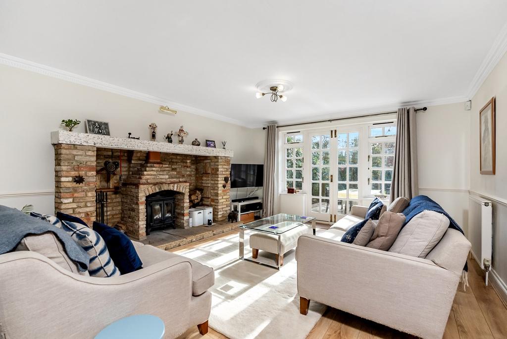 A double aspect room with double glazed window to front aspect and two double glazed windows to rear, double glazed French doors to patio, central brick built ingle nook fire place with inset multi fuel stove, two radiators, TV point, coving to ceiling.